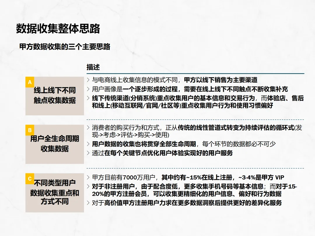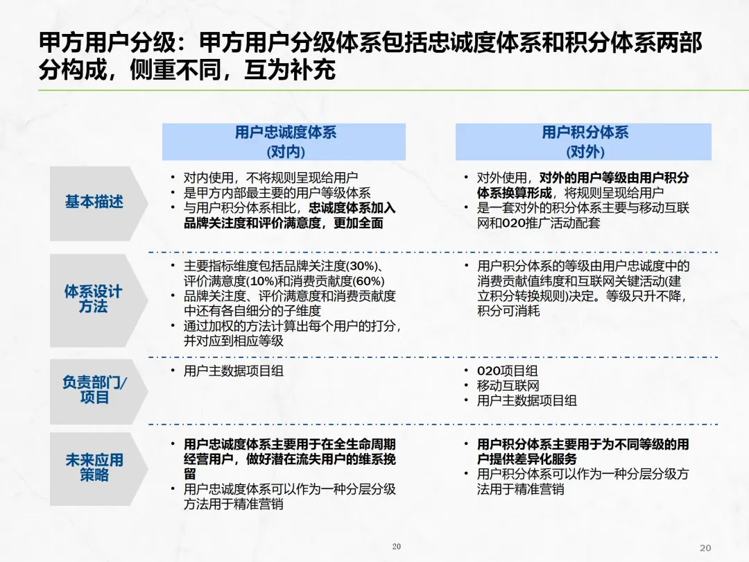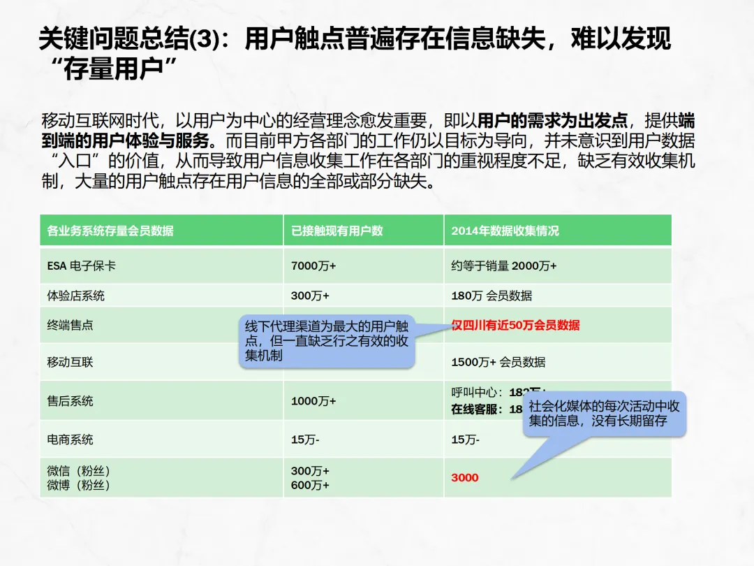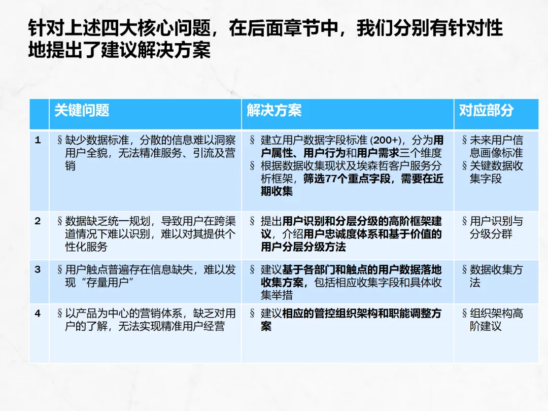 本方案为XX集团用户主数据治理项目的系统性规划,旨在解决当前用户数据分散、标准缺失、难以识别与精准运营的核心问题,构建以用户为中心的360度洞察与服务体系。方案通过现状诊断,识别出四大关键问题:数据标准缺乏、跨渠道用户识别困难、触点信息收集不足、营销体系以产品为中心。针对性地提出了用户信息画像标准(属性、行为、需求三维度)、线上线下用户识别与归并机制、分级分群模型(忠诚度与积分体系),并规划了覆盖全生命周期的数据收集路径与各触点(线下渠道、体验店、客服、线上平台)的具体执行细则与考核方法。在组织保障方面,建议建立总部用户管理委员会与数据管控团队,并逐步完善总部与省代的数据管理职能,确保治理工作的有效推进与持续优化。最后,方案明确了未来工作演进路径,从“理解用户现状”到“满足与引导用户需求”,分阶段推动用户分析、服务、运营、营销等能力的全面提升。