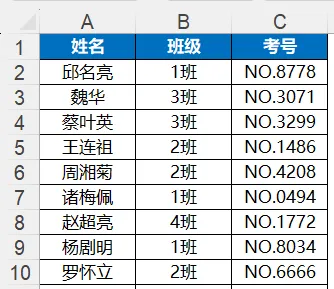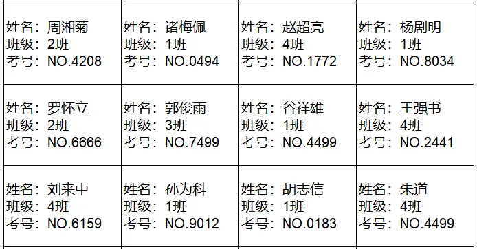 将姓名、班级、考号等信息录入Excel,确保每列字段清晰,如下表所示。