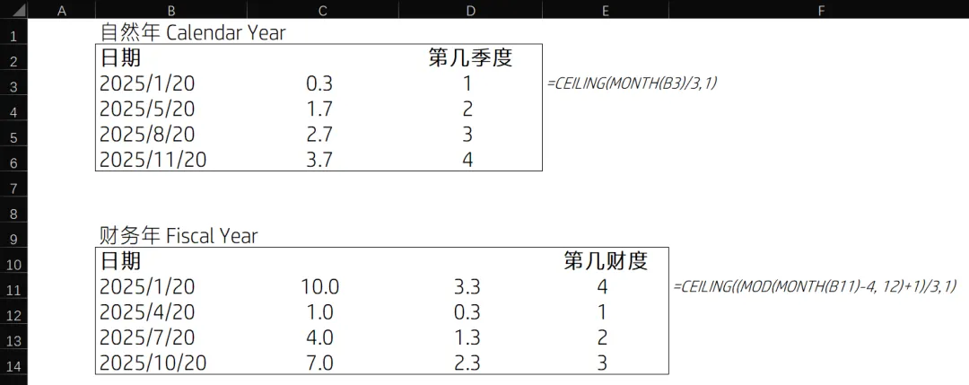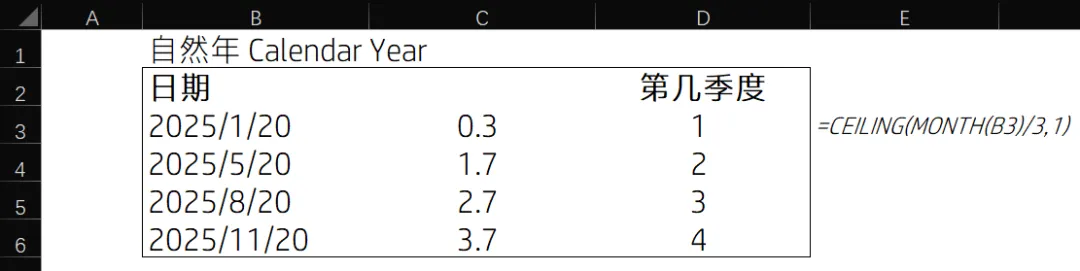 MONTH函数先将"2025/1/20"里的月份取出,这里取出的是1,然后除以3得到0.3,最后用CEILING函数向上取整得到1(0.3向上取整=1,1.7向上取整=2), 这样自然月的季度就准确的计算出来了。