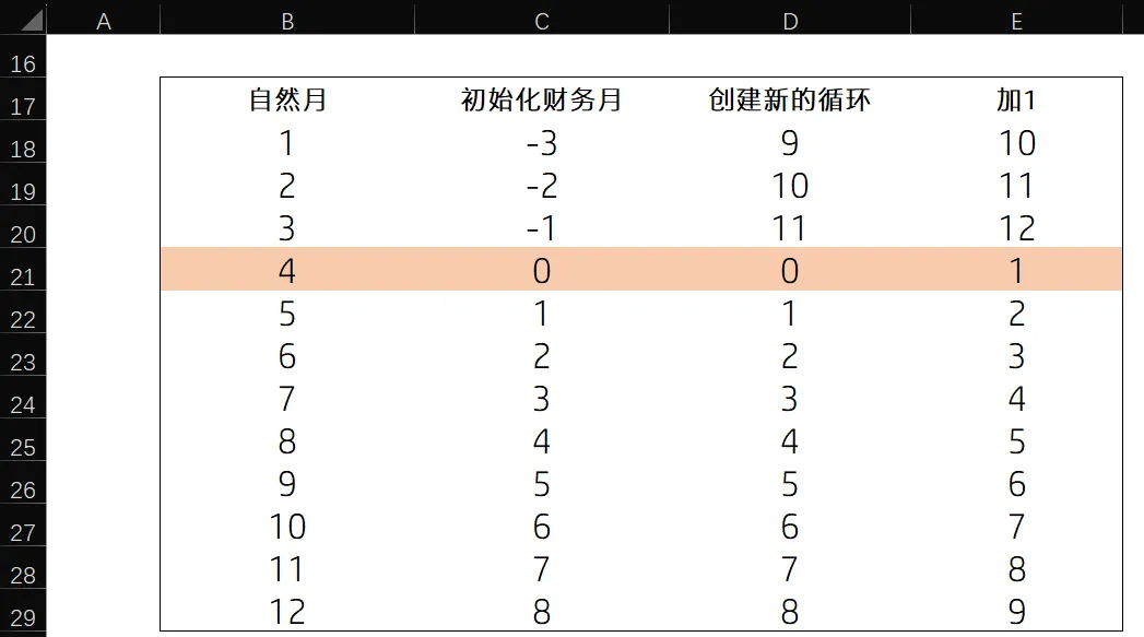 最后整体+1, 最终变成如E列也就是我们真正想要的序列:从4月开始到下一年3月结束的财务月序列。