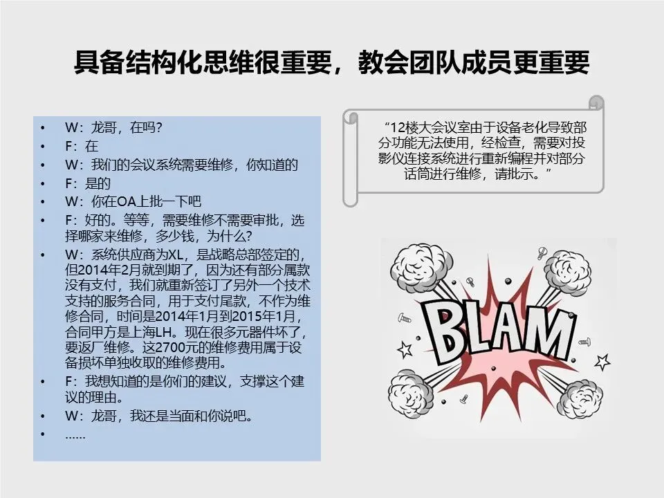 比如申请维修会议室设备,无效表达是堆砌合同、费用等细节;结构化表达则是直陈核心:“12楼大会议室设备老化,需维修投影仪系统和话筒,请批示。”一句话点明结论,让人瞬间抓住重点。