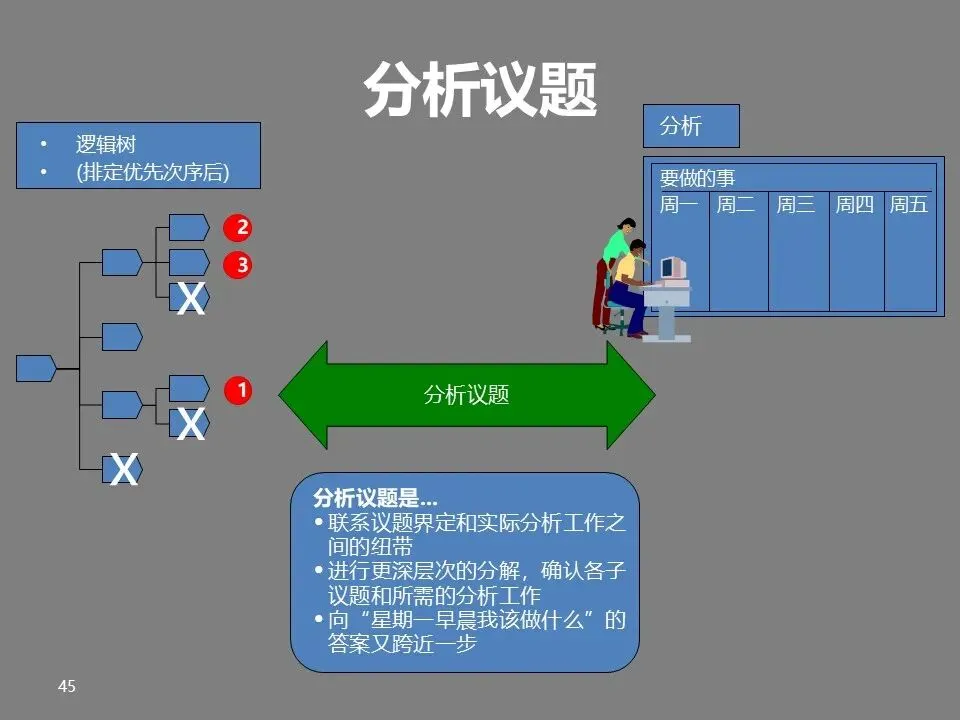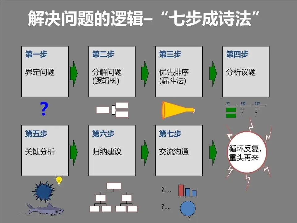 遇到复杂问题时,可套用“七步成诗法”:界定问题、分解问题、优先排序、分析议题、关键分析、归纳建议、交流沟通。这套流程能帮你将难题拆解为可执行的小任务,避免眉毛胡子一把抓。
