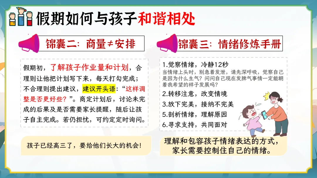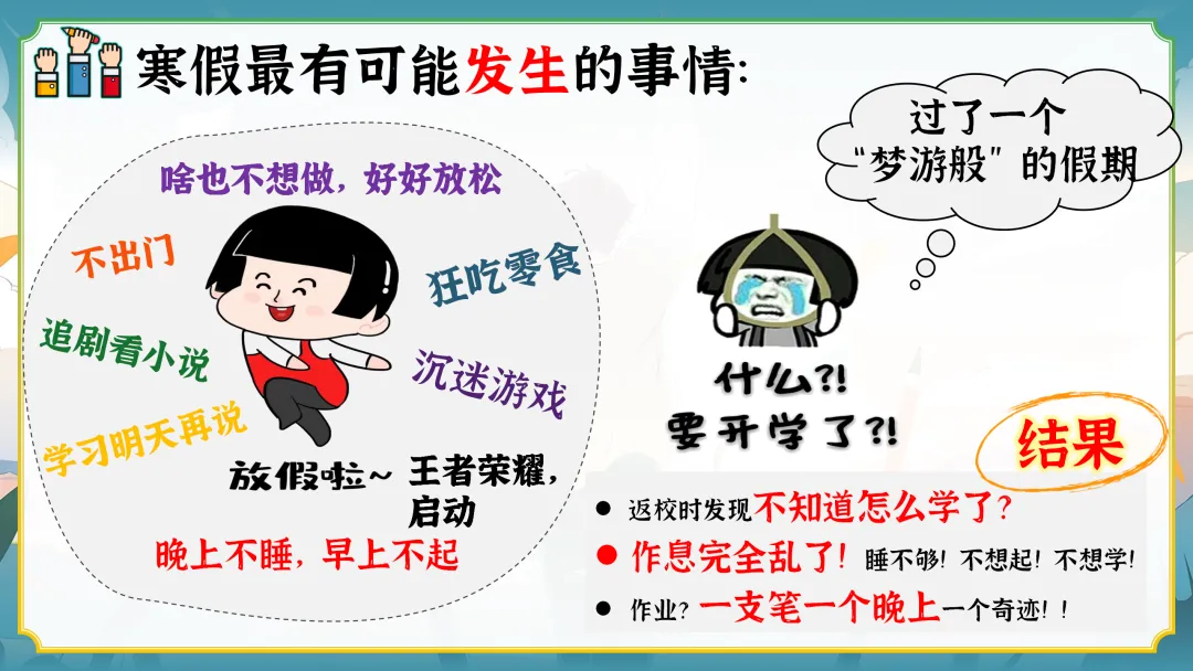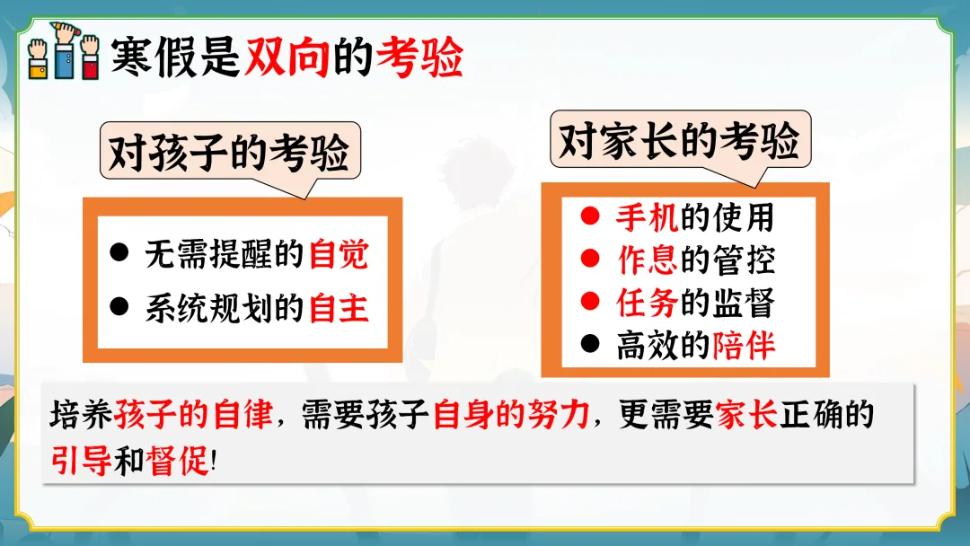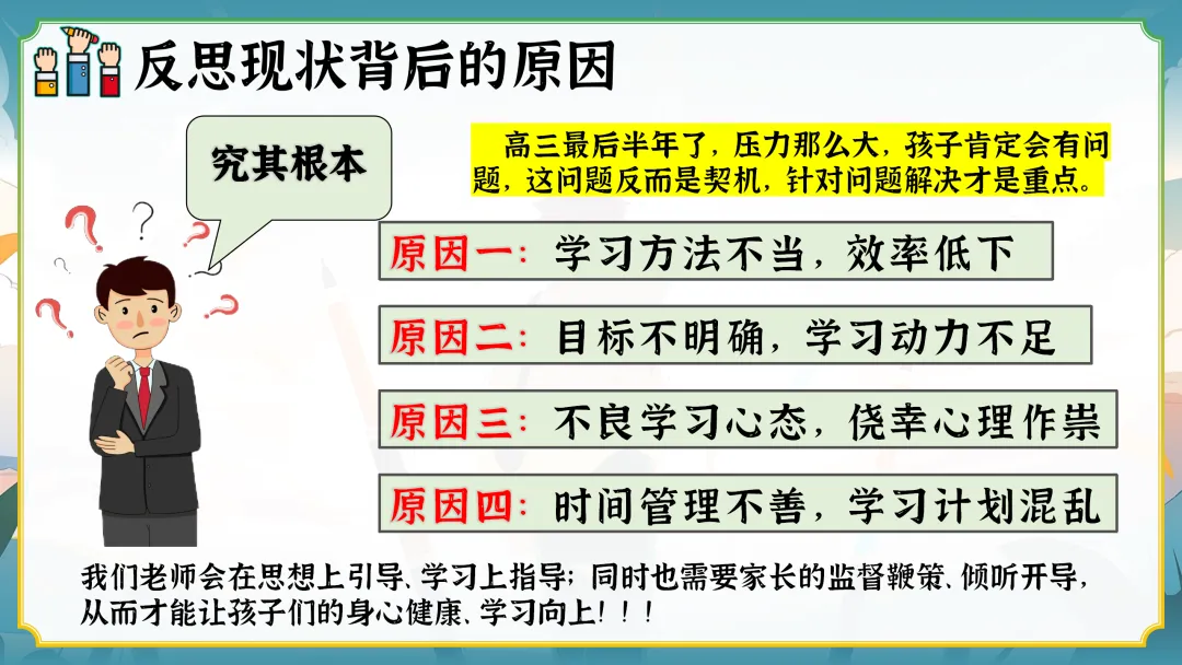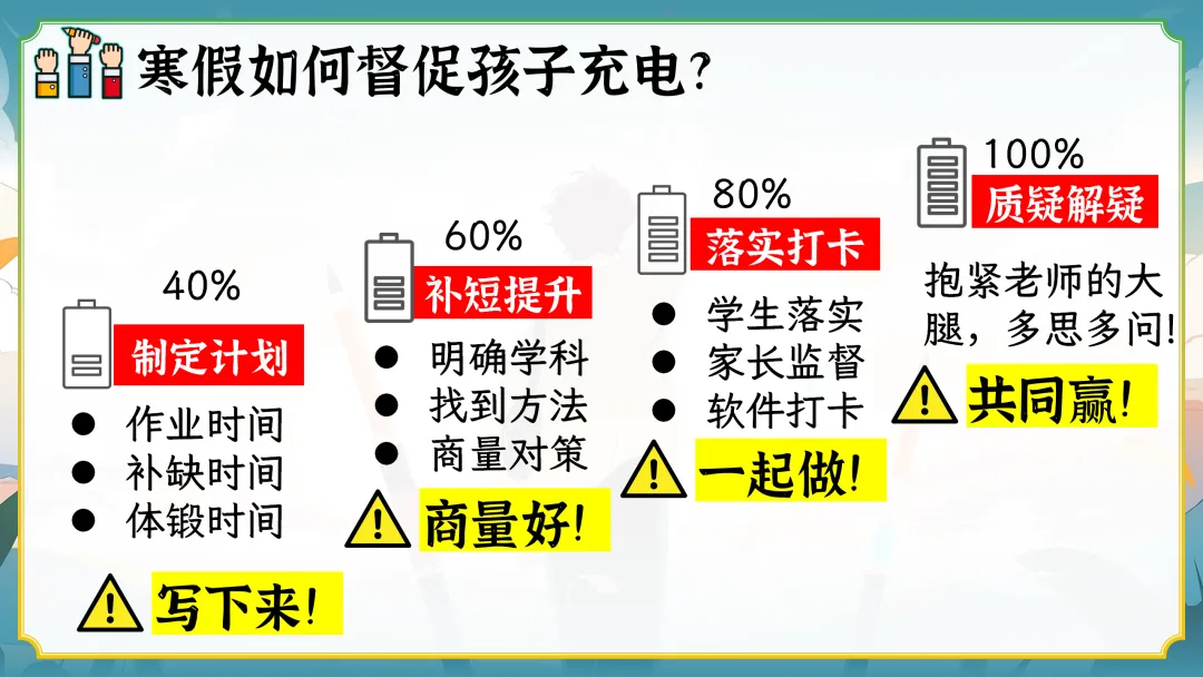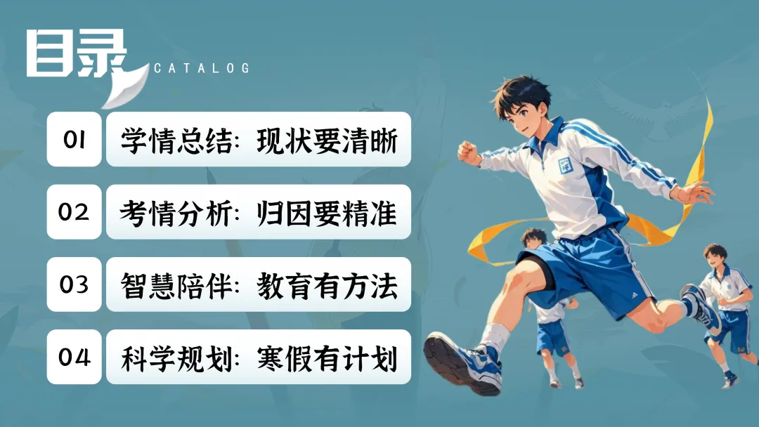 此次家长会主要内容分为4大点:01学情总结:现状要清晰;02考情分析:归因要精准;03智慧陪伴:教育有方法;04科学规划:寒假有计划。
