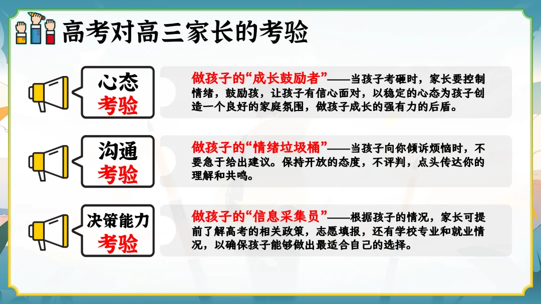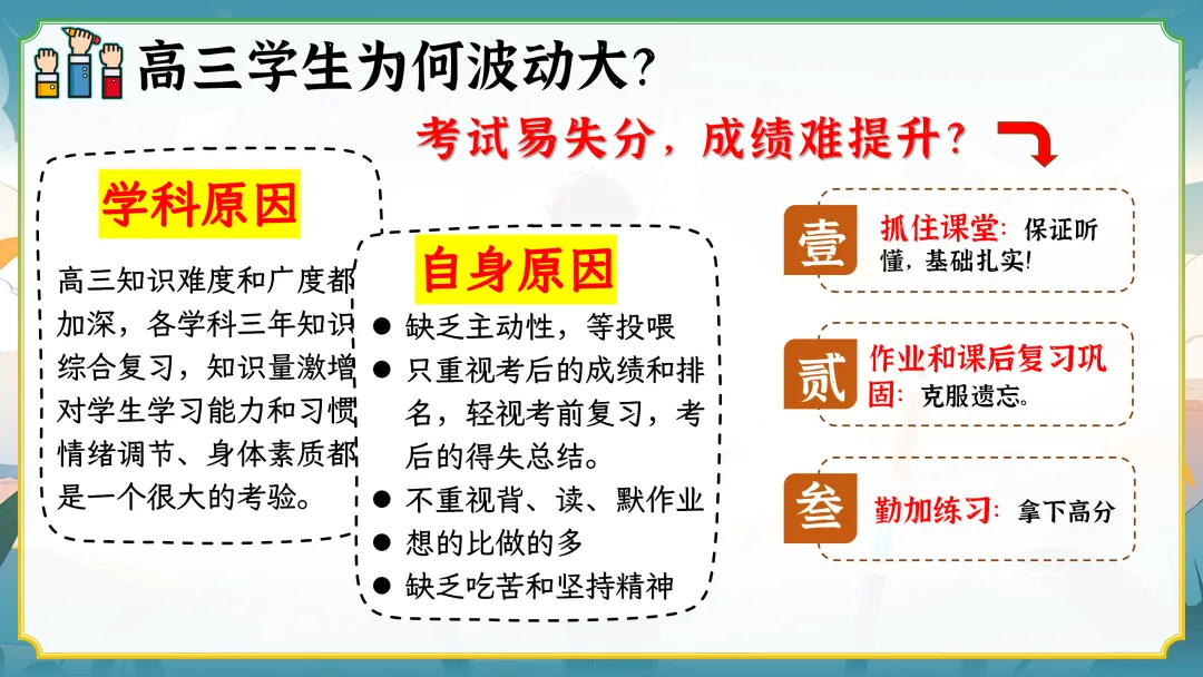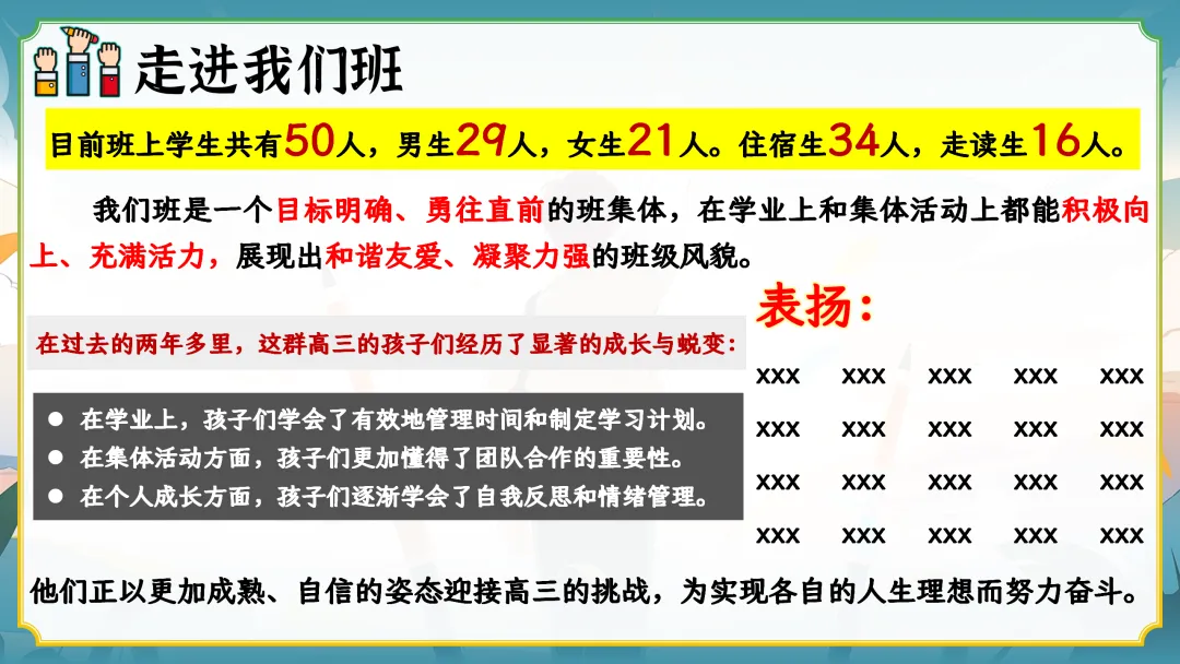 在高三这一关键时期,每一步都承载着孩子们的未来。今天,我们齐聚于此,召开“家校携手育栋梁 师生连心赢寒假” 期末家长会。家校合作犹如车之两轮、鸟之双翼,唯有紧密相连,才能助力孩子在成长之路上稳步前行。此次家长会不仅是对本学期学习成果的总结,更是为孩子们规划一个充实且意义非凡寒假的契机,让我们共同携手,为孩子的梦想添砖加瓦。