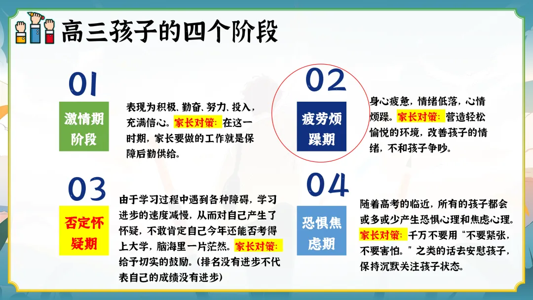 01激情期阶段:表现为积极、勤奋、努力、投入,充满信心。家长对策:在这一时期,家长要做的工作就是保障后勤供给。