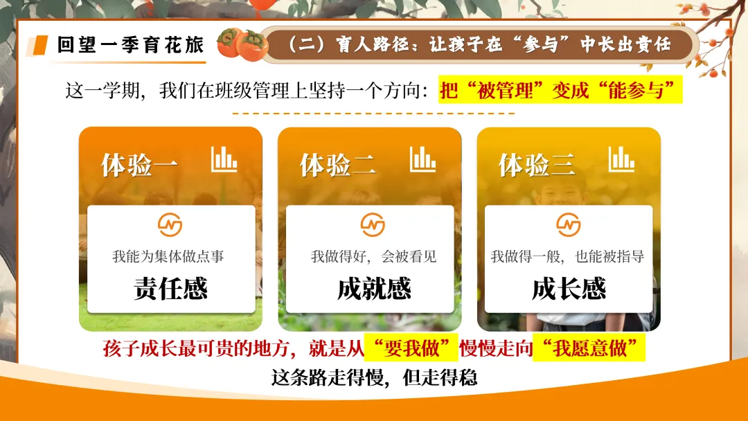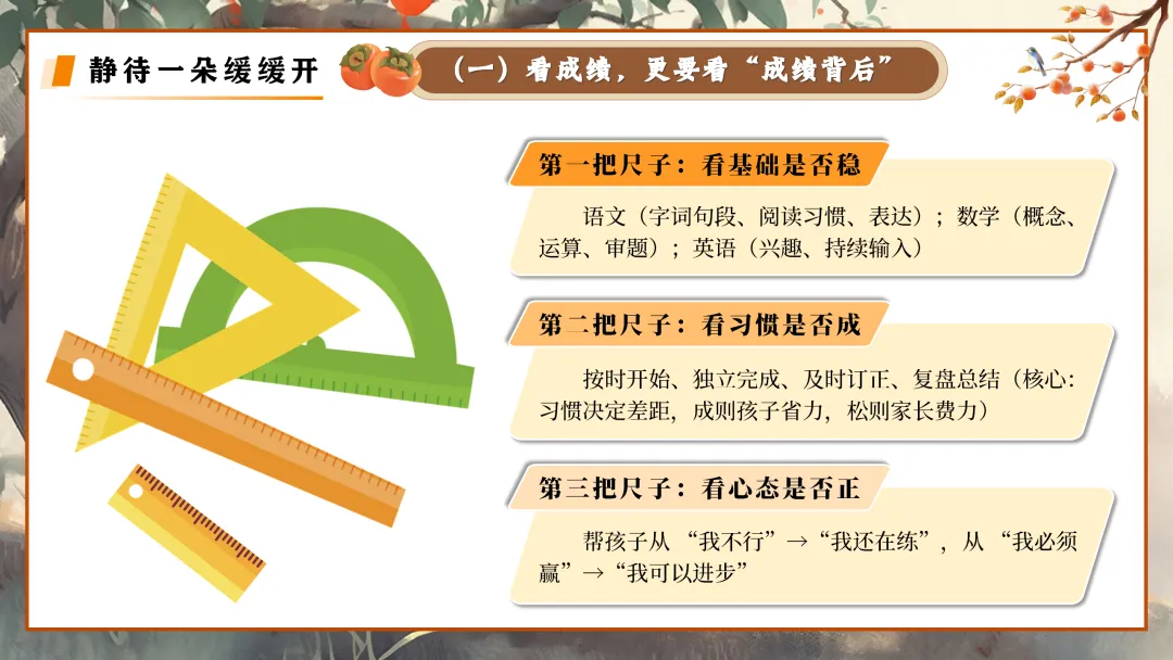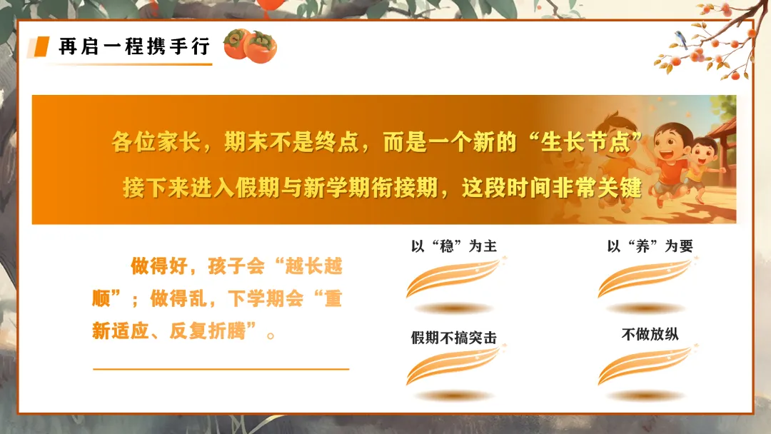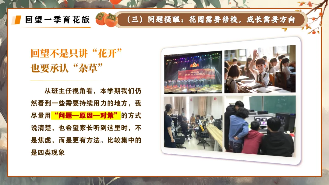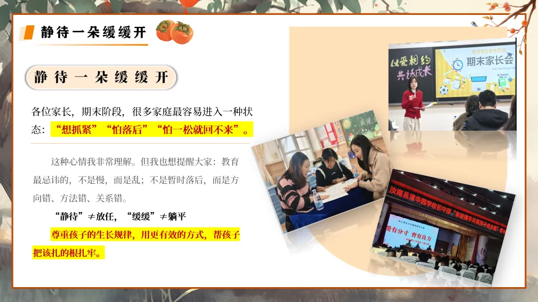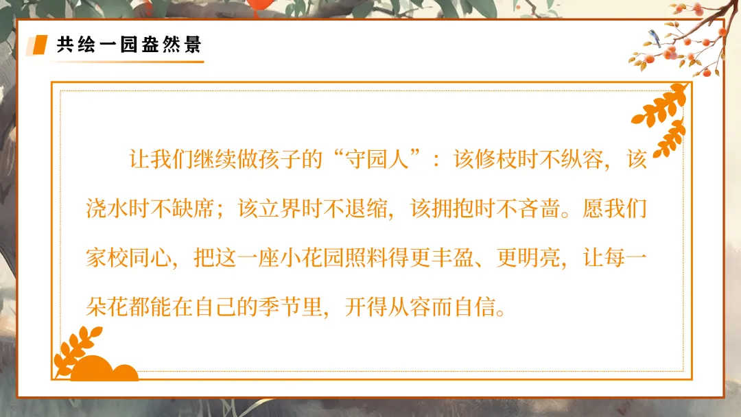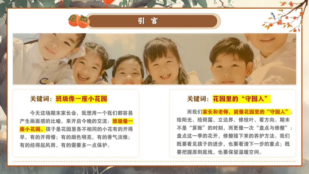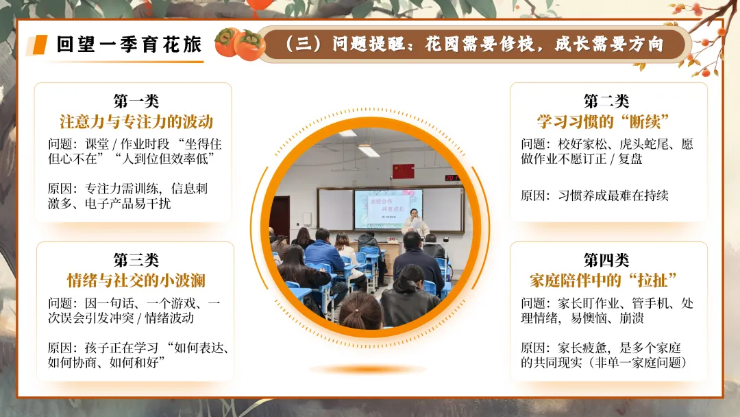 今天这场期末家长会,我想用一个我们都容易产生画面感的比喻,来开启今晚的交流:班级像一座小花园。孩子是花园里各不相同的小花有的开得早,有的开得慢;有的颜色明亮,有的香气淡雅;有的经得起风雨,有的需要多一点保各位家长,先允许我用“回望”作为开场。因为期末最重要的,不是“哪一次考试考了多少分”,而是这一学期,孩子在学校和家庭之间,经历了哪些成长的真实发生。