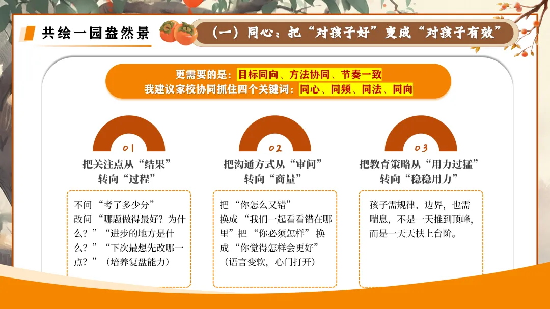 如果说第二部分强调“理解孩子的节奏”,那么第三部分我想强调“家校怎么发力”。家校共育,最怕两种状态:一种是“各忙各的”,信息断层;一种是“互相抱怨”,彼此对立。我们更需要的是:目标同向、方法协同、节奏一致。我建议家校协同抓住四个关键词:同心、同频、同法、同向。