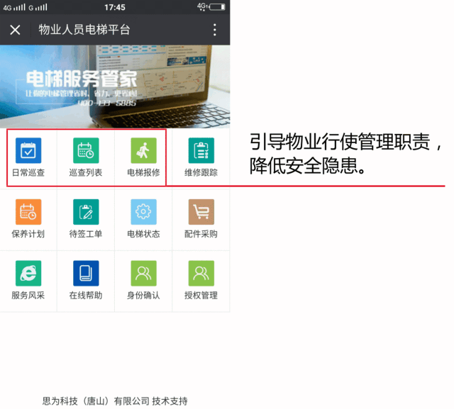 思为科技【电梯服务管家】,为全国的电梯公司提供专业高效的微信的维保管理系统与服务。不仅协助电梯公司安排日常的维保工作、优化维保服务流程;用客观真实的数据信息为电梯公司优化服务质量、打造维保服务团队;还可以合理利用平台运营的方法拓展巩固维保业务。