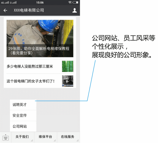 微信公众号,如名片、宣传手册、网站一样,已经成为展现企业活力与实力的专属标配。【电梯服务管家】为电梯公司搭建自己的专属平台,将电梯公司销售、安装、维保服务、企业品牌展现的更加系统和专业。