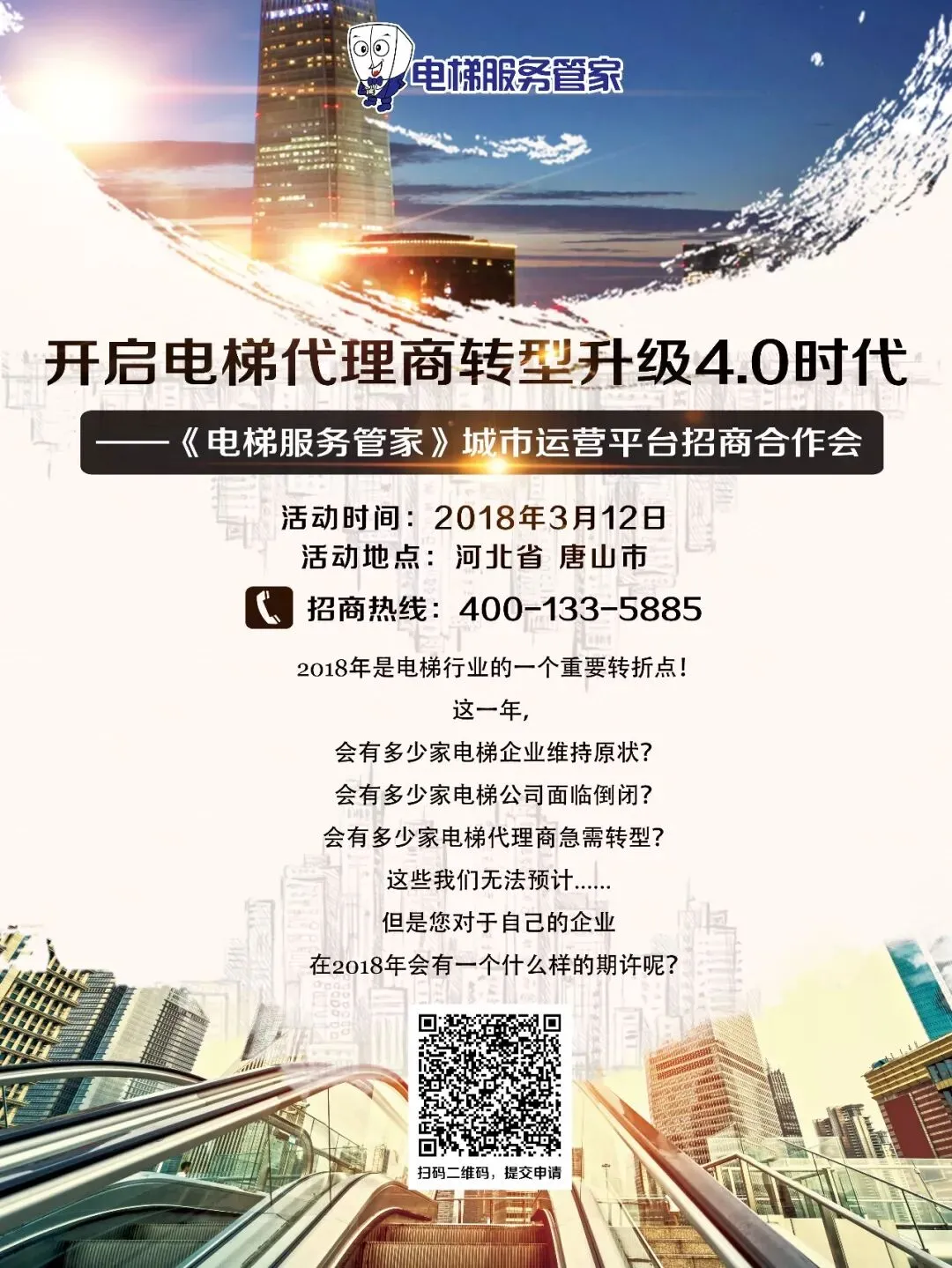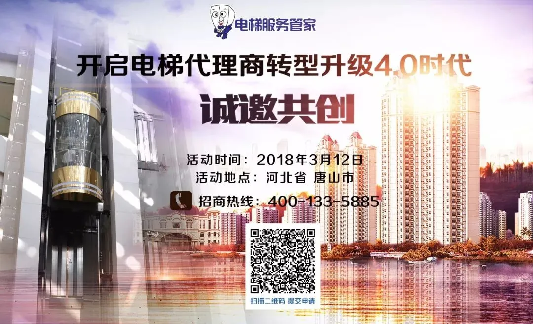 开启电梯代理商转型升级4.0时代,3月12日电梯服务管家城市运营合作会在河北唐山举办,诚邀注重电梯维保服务市场的电梯公司莅临现场,进入“互联网+电梯”的数字经济领域,轻松布局电梯后市场。