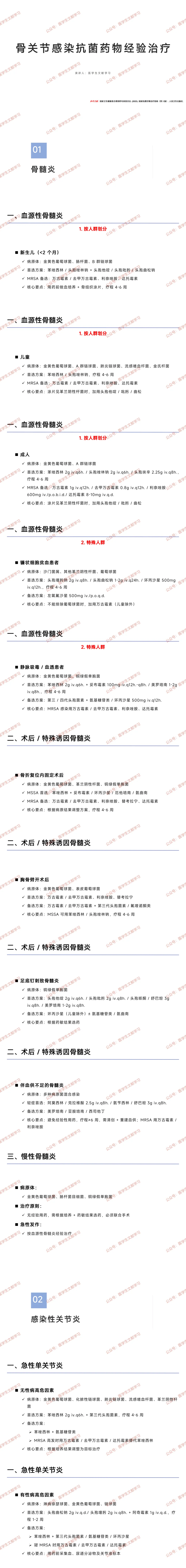 - 骨折复位内固定术后:MSSA 首选苯唑西林 + 妥布霉素等,MRSA 备选万古霉素等,疗程 4-6 周。