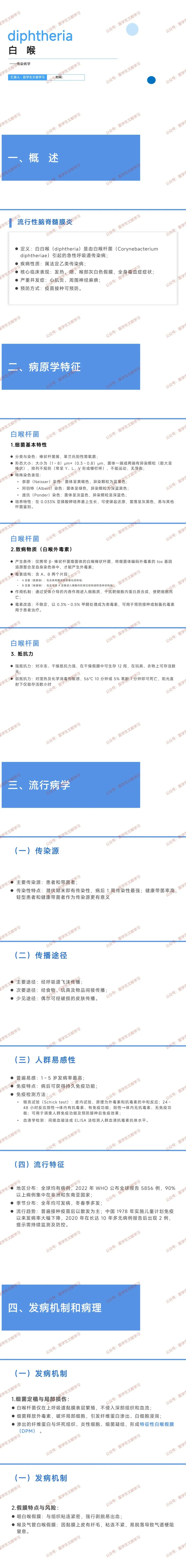 - 定义:由白喉杆菌引起的急性呼吸道传染病,属法定乙类传染病。