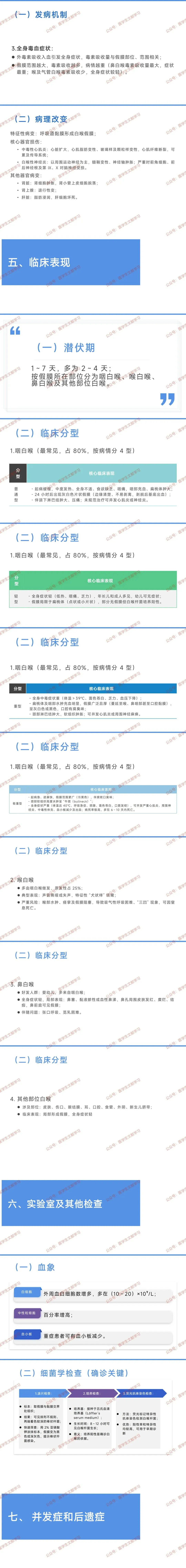- 核心表现:发热、咽 / 喉部灰白色假膜、全身毒血症症状,严重时可并发心肌炎、周围神经麻痹。