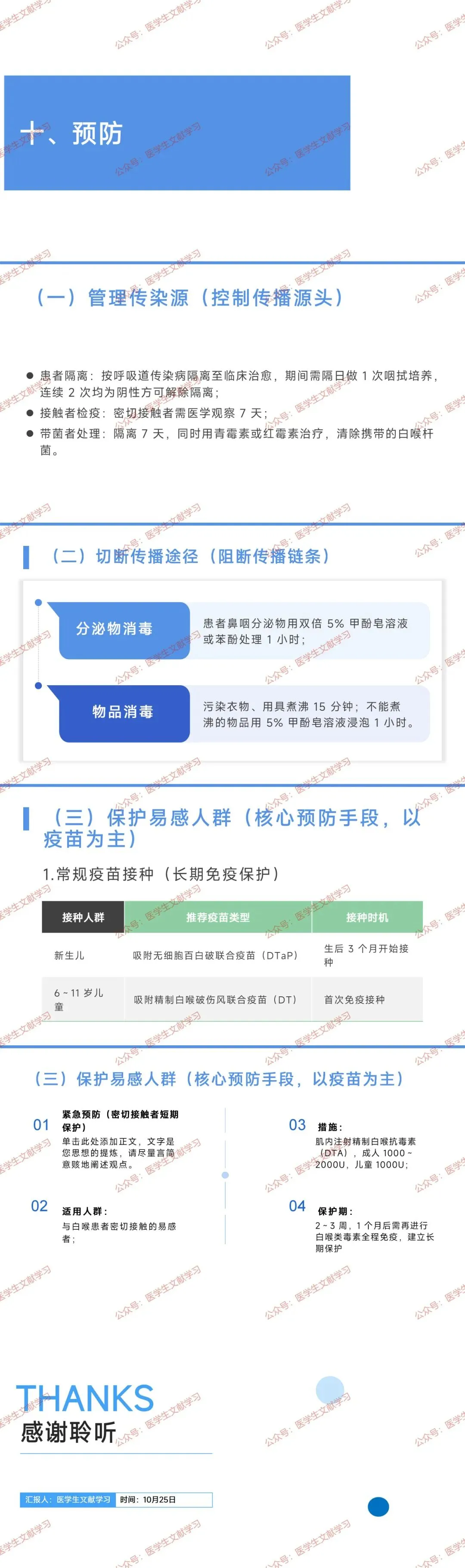 - 紧急预防:密切接触易感者肌内注射精制白喉抗毒素(成人 1000~2000U,儿童 1000U),保护期 2~3 周,1 个月后需全程类毒素免疫。