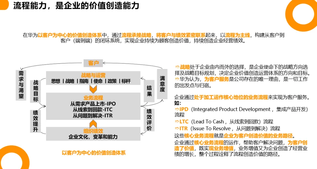 华为从2.1万元起步发展为年收入超7000亿的世界级企业,其核心秘诀在于构建了一套"无生命流程管理体系",将组织能力建设在流程之上。所谓"流程即组织力",是指流程不仅是业务活动的规范,更是企业最佳经验的总结与资源最优匹配的载体。华为认为,流程是战略的"执行者",通过端到端的价值创造路径,将个人能力转化为组织能力,用规则的确定性对抗结果的不确定性,最终实现"业务跑在流程上,能力建在组织上"的管理境界。