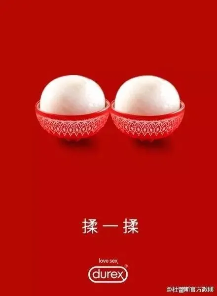 这类海报需要找到一个适合的物品作为切入点,举个栗子,杜杜家的产品最容易让人联想到的物品有:针(大雾)、香蕉、黄瓜、等一切棍状造型的物体(天惹噜,我这都在写些什么!!!)所以,杜杜家也经常会用到这类作为暗示,要么是在形态上有所类似(粽子的那个造型真是绝了!),要么就是在语义上类似(外套跟套套),总之需要配合好的文案,表达的很含蓄。