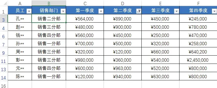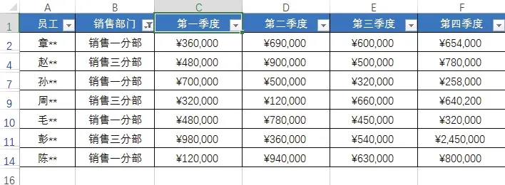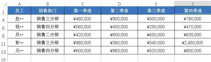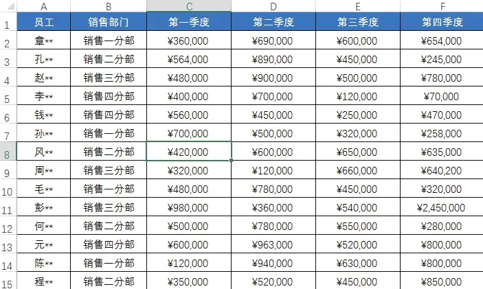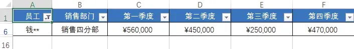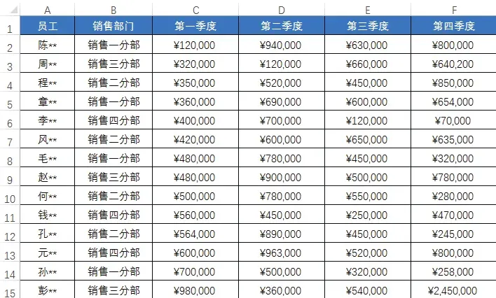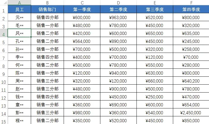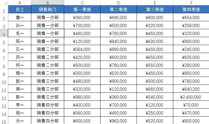 下图所示为“员工季度销售表”,在该表格中可看到不同销售部门的各个员工在各个季度的销售情况。
