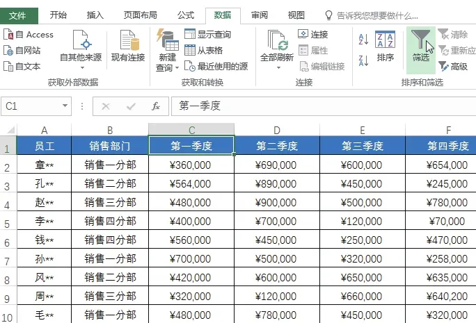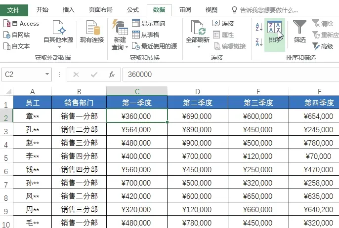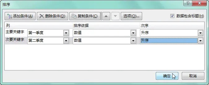 选中任意数据单元格,如单元格C2,切换至“数据”选项卡,在“排序和筛选”组中单击“排序”按钮,如下图所示。弹出“排序”对话框,设置“主要关键字”为“第一季度”,并设置好“排序依据”和“次序”,单击“添加条件”按钮,增加一个“次要关键字”,并设置其为“第二季度”,随后设置“排序依据”和“次序”,单击“确定”按钮,如下图所示。返回工作表中,即可看到工作表中的数据会首先对“第一季度”的销售数据进行升序排列,当遇到相同的销售数据时,则会以“第二季度”的销售额从低到高进行排列,如下图所示。一般情况下,文本数据,如员工姓名、销售部门等在进行排序时,默认是按照字母顺序进行排序的,在实际工作中,用户还可以按照文本数据的笔画进行排序。