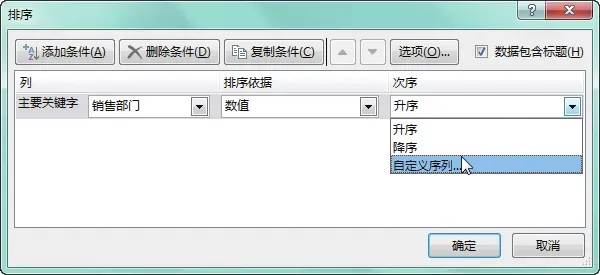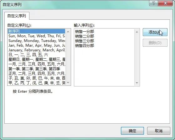 选中任意数据单元格,打开“排序”对话框,设置“主要关键字”为“销售部门”,并设置好“排序依据”,单击“次序”右侧的下拉按钮,在展开的列表中选择“自定义序列”选项,如下图所示。弹出“自定义序列”对话框,在“输入序列”列表框中输入自定义的序列,单击“添加”按钮,如下图所示。在输入序列时,可使用“Enter”键换行。连续单击“确定”按钮,返回工作表中,即可看到工作表中的数据以自定义的顺序排序,如下图所示。为了方便数据的查看、统计和打印,有时只想显示符合条件的数据,就可以使用Excel中的“筛选”功能,该功能可以在众多的数据中找到想要的数据。