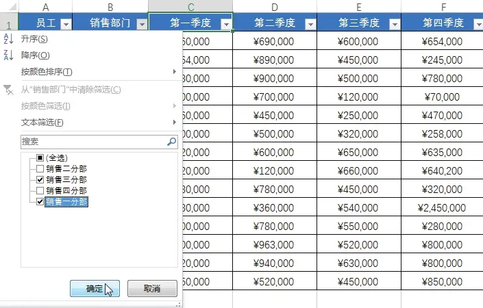选中任意数据单元格,切换至“数据”选项卡,单击“排序和筛选”组中的“筛选”按钮,如下图所示。单击“销售部门”右侧的筛选按钮,在展开的列表中取消选中“全选”复选框,选中“销售三分部”和“销售一分部”复选框,单击“确定”按钮,如下图所示。完成筛选后,即可看到筛选出的销售部门为一分部和三分部的销售数据,如下图所示。当用户对筛选的条件不能完全掌握时,可根据筛选功能中的搜索框模糊筛选出符合部分条件的财务数据,具体操作步骤如下。