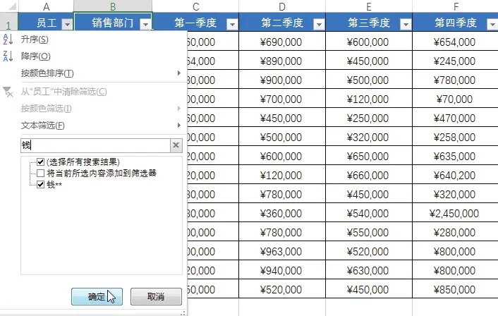 选中任意数据单元格,在“数据”选项卡下单击“排序和筛选”组中的“筛选”按钮,单击“员工”右侧的筛选按钮,在展开的列表的搜索框中输入要模糊筛选的内容“钱”,单击“确定”按钮,如下图所示。完成后,即可看到工作表中筛选出的“员工姓名”包含“钱”的销售记录,如下图所示。如果要筛选出一列数据的多条件数据记录,则可以通过“自定义筛选”方式来完成,具体操作步骤如下。