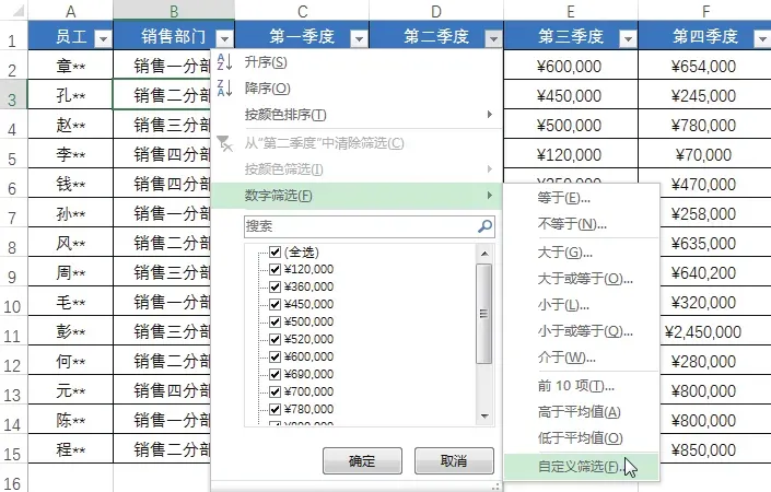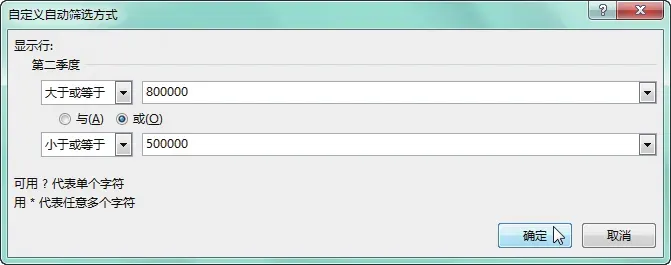 选中任意数据单元格,在“数据”选项卡下单击“排序和筛选”组中的“筛选”按钮,单击“第二季度”右侧的筛选按钮,在展开的列表中选择“数字筛选”→“自定义筛选”选项,如下图所示。弹出“自定义自动筛选方式”对话框,设置要筛选的条件为第二季度销售额大于或等于800 000 元或第二季度销售额小于或等于 500 000元,单击“确定”按钮,如下图所示。返回工作表中,即可看到筛选出的第二季度销售额大于 800 000 元或销售额小于 500 000元的数据记录,如下图所示。“高级筛选”一般用于条件较复杂的筛选操作,通过此筛选方式,既可以在原数据表格中显示筛选的结果,不符合条件的记录被隐藏起来;也可以在新的位置显示筛选结果,不符合条件的记录同时保留在数据表中而不会被隐藏起来,这样就更加便于进行数据的对比。用户可根据实际条件选择合适的筛选结果位置。