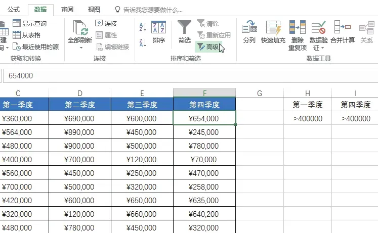 在 H 列和 I 列中输入要筛选的条件,选中表格中的任意数据单元格,切换至“数据”选项卡,单击“高级”按钮,如下图所示。弹出“高级筛选”对话框,设置“方式”为“在原有区域显示筛选结果”,设置好“列表区域”和“条件区域”,单击“确定”按钮,如下图所示。返回工作表中,即可看到筛选出的第一季度销售额大于 400 000 且第四季度销售额也大于400 000 的数据记录,如下图所示。如果要返回未筛选前的数据效果,则在“数据”选项卡下的“排序和筛选”组中单击“清除”按钮。如果要快速计算相同类别数据行的合计值,可通过Excel中的“分类汇总”功能来实现。但是需注意的是,在分类汇总前,为了让相同类别的数据行汇总在一个类别中,首先需要对表格按关键字段进行排序操作。