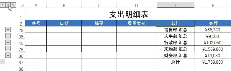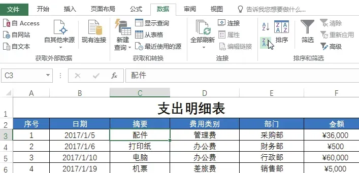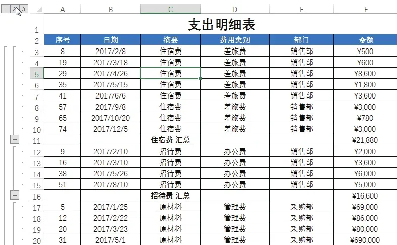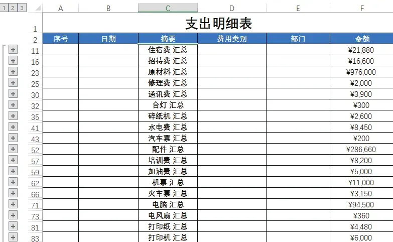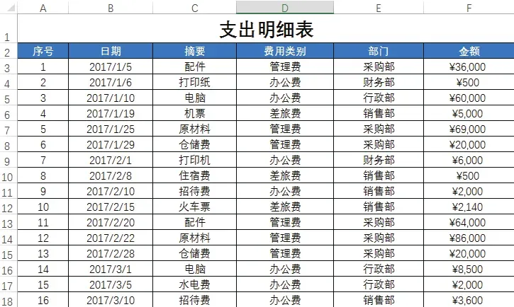 下图所示为“支出明细表”,在该表格中可看到各个日期的支出摘要、费用类别、部门及支出金额数据。