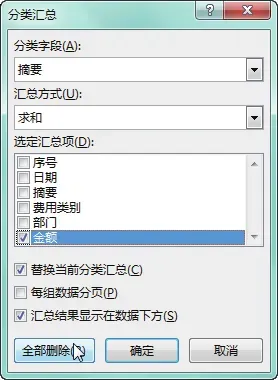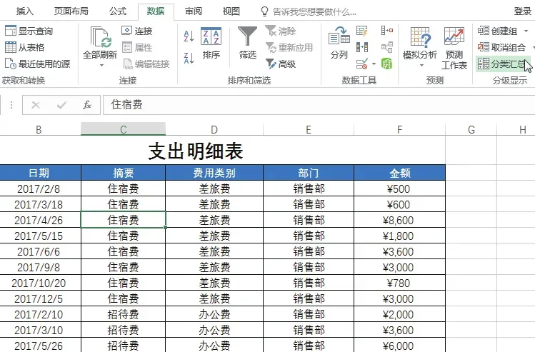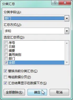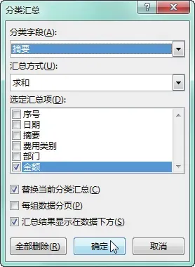 现要对“摘要”和“部门”列的数据分别进行分类汇总,具体操作步骤如下。选中要分类汇总列的任意数据单元格,如要对“摘要”列进行分类汇总,则选中 C 列的任意数据单元格,如单元格 C3,切换至“数据”选项卡,在“排序和筛选”组中单击“降序”按钮,如下图所示。可看到表格数据会根据摘要列中的数据进行降序排序,在“数据”选项卡下的“分级显示”组中单击“分类汇总”按钮,如下图所示。弹出“分类汇总”对话框,设置“分类字段”为“摘要”,保持默认的“汇总方式”,在“选定汇总项”列表框中选中“金额”复选框,单击“确定”按钮,如下图所示。返回工作表中,即可看到表格中的数据会以“摘要”为类别对本年的支出“金额”进行汇总,单击列标题左侧的分类汇总编号,如单击编号“2”,如下图所示。即可看到表格将隐藏各个摘要列中的三级明细数据,而只显示二级明细数据,如下图所示。再次打开“分类汇总”对话框,单击“全部删除”按钮,如下图所示。返回未分类汇总前的效果,然后对“部门”列的数据进行降序排序,将相同类的部门放在相邻的位置,然后打开“分类汇总”对话框,设置“分类字段”为“部门”,保持默认的“汇总方式”,在“选定汇总项”列表框中选中“金额”复选框,单击“确定”按钮,如下图所示。返回工作表中,单击分类汇总编号“2”,即可看到各个部门的支出“金额”数据,如下图所示。