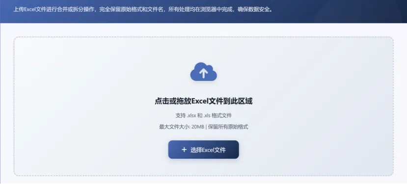 一、双击运行:打开excel_merge_split_html.exe文件三、上传文档:点击“选择Excel文件”,按住shift键或者Ctrl键选中文件;或者直接将文件拖拽到区域内即可。