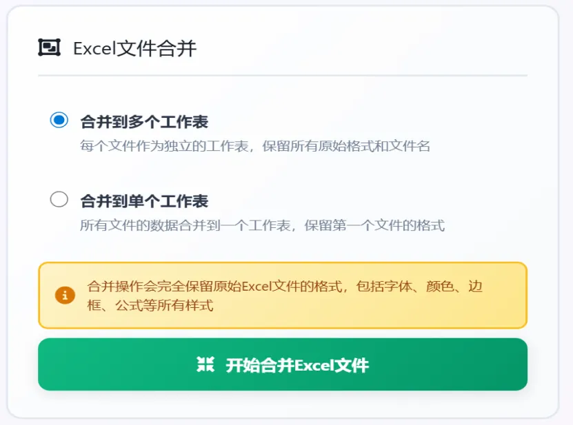五、文件合并:可以选择“合并到多个工作表”或者“合并到单个工作表”,合并后能够保留原来文件的格式。