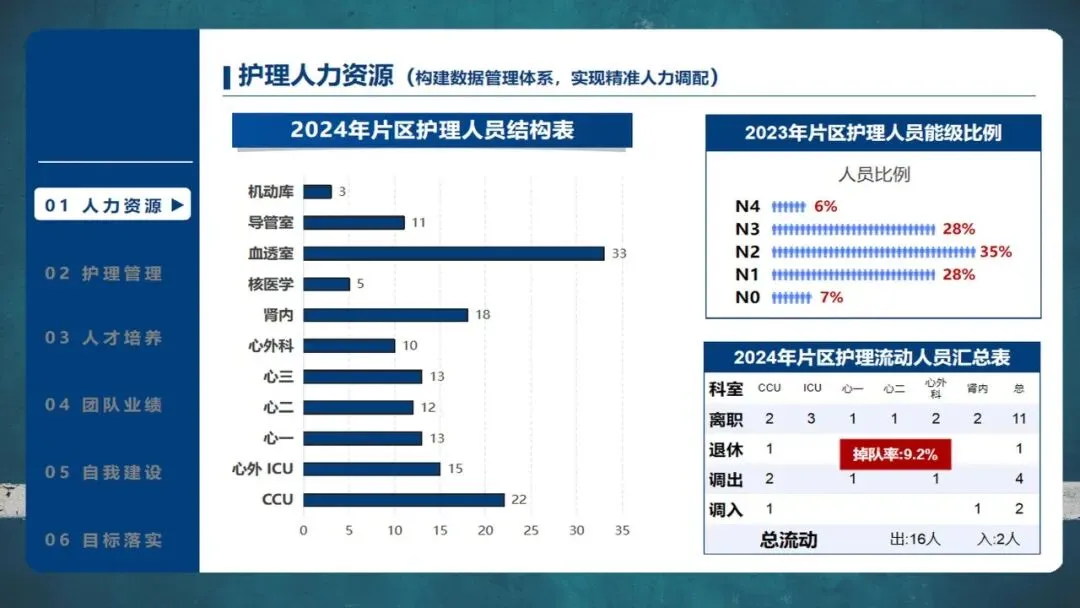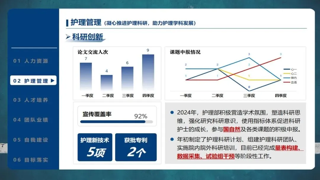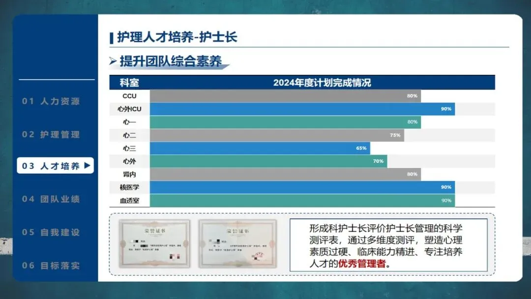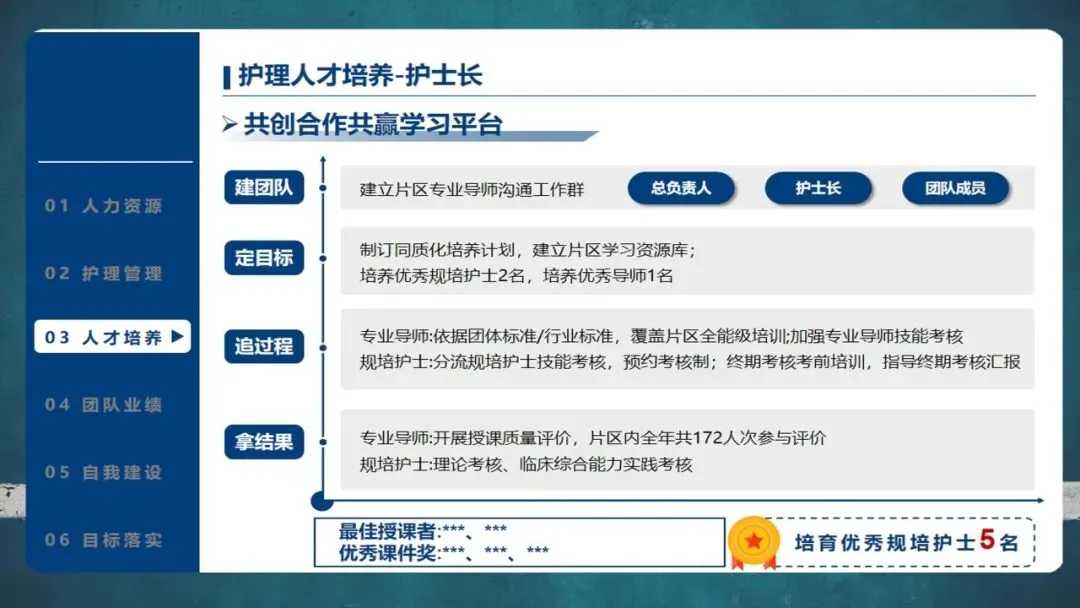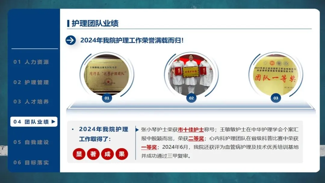 在人才培养上,我们注重护士长及专业导师的能力提升,通过信息分享、实践清单革命等方式,塑造了一支高素质的管理队伍。团队业绩方面,我们荣誉满载,多名护士及团队在各类比赛中脱颖而出,为医院赢得了广泛赞誉。