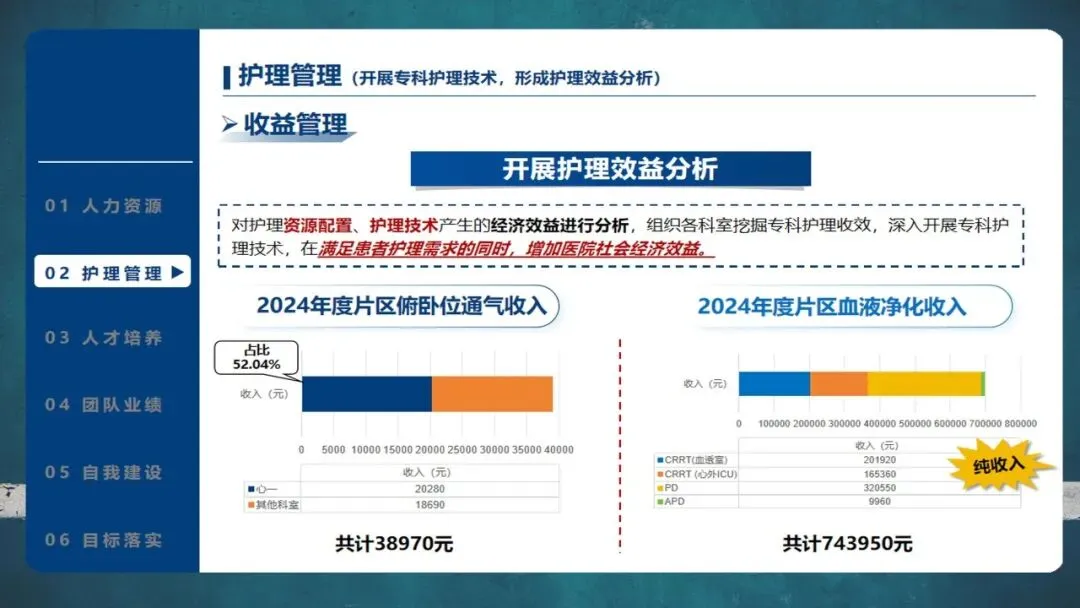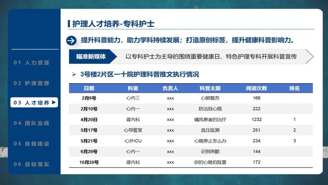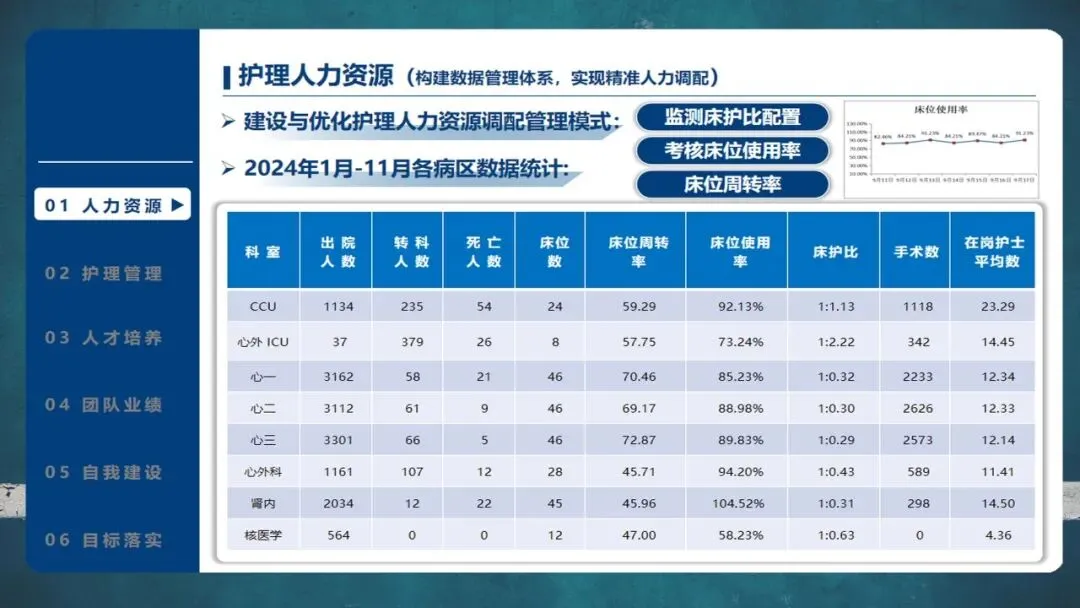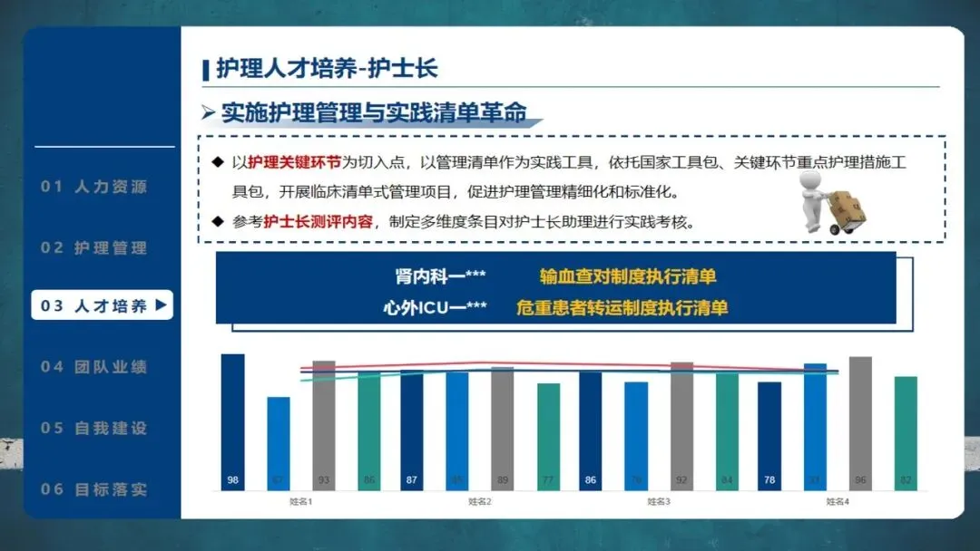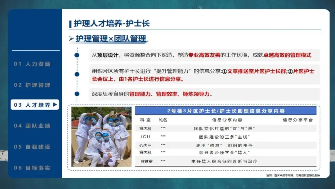 在人才培养上,我们注重护士长及专业导师的能力提升,通过信息分享、实践清单革命等方式,塑造了一支高素质的管理队伍。团队业绩方面,我们荣誉满载,多名护士及团队在各类比赛中脱颖而出,为医院赢得了广泛赞誉。