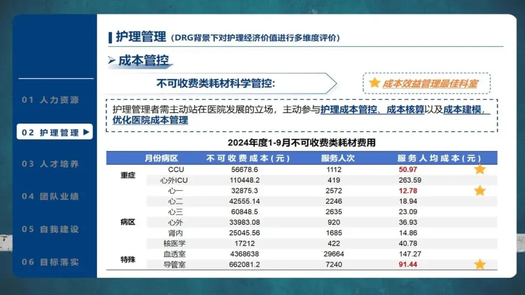 大家好!今天,我非常荣幸能在这里与大家分享我们2025年护理工作的年终总结。这一年,我们护理团队在人力资源优化上构建了数据管理体系,实现了精准人力调配,有效应对了人力资源短缺的挑战。在护理管理方面,我们紧跟DRG背景,对护理经济价值进行了多维度评价,通过科学管控不可收费类耗材,显著降低了成本。同时,我们深入开展专科护理技术,如俯卧位通气和血液净化,不仅满足了患者需求,更提升了医院的社会经济效益。
