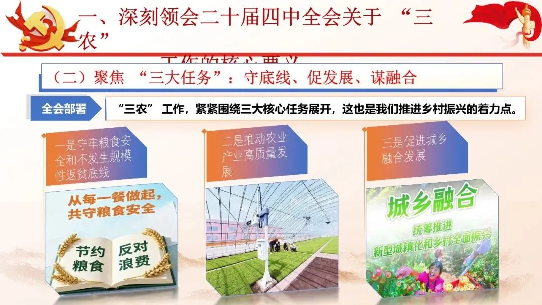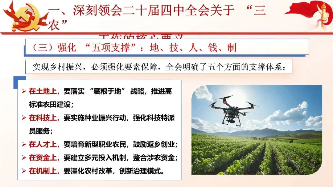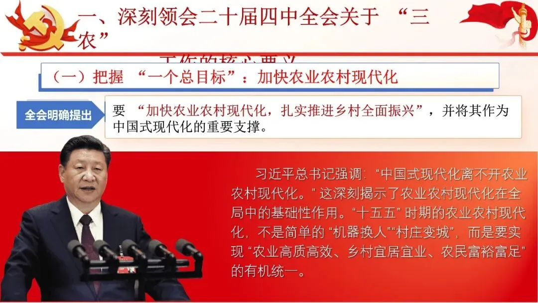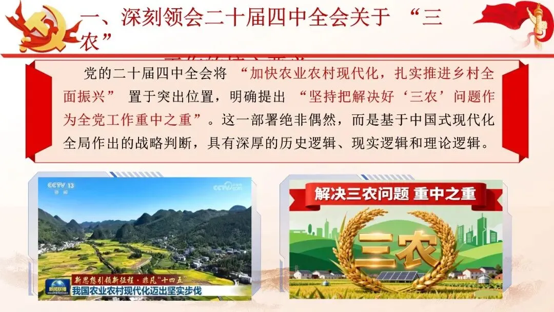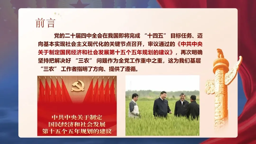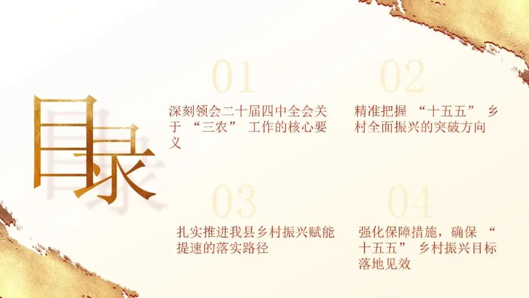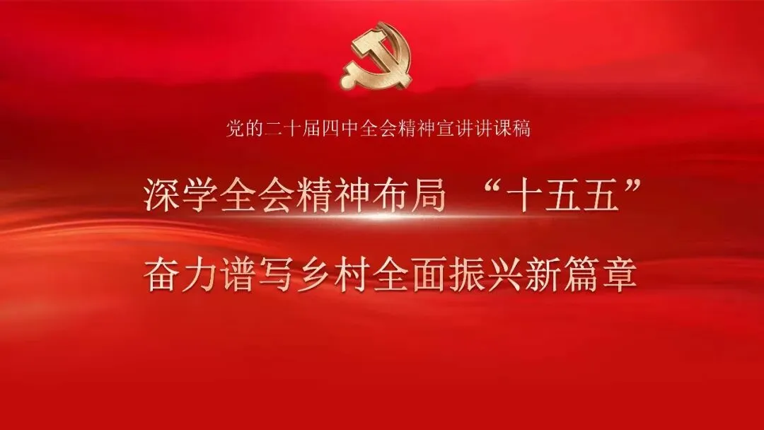 大家好!今天我们召开这次宣讲会,核心是深入学习贯彻党的二十届四中全会精神,重点围绕“十五五” 时期如何为乡村全面振兴赋能提速、推动乡村全面振兴取得重大突破这两个关键问题,结合咱们县乡村工作实际,谈思路、讲方法、定路径。党的二十届四中全会在我国即将完成 “十四五” 目标任务、迈向基本实现社会主义现代化的关键节点召开,审议通过的《中共中央关于制定国民经济和社会发展第十五个五年规划的建议》,再次明确坚持把解决好 “三农” 问题作为全党工作重中之重,这为我们基层 “三农” 工作者指明了方向、提供了遵循。