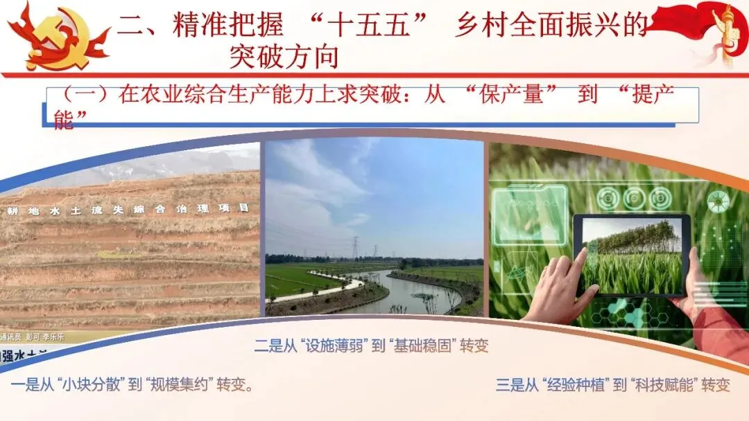 作为农业大县,咱们县耕地面积 XX 万亩,农业人口 XX 万人,乡村振兴的成效直接关系到全县现代化建设的成色。“十四五” 期间,咱们县粮食产量连续五年稳定在 XX 亿斤以上,脱贫攻坚成果持续巩固,建成省级现代农业产业园 X 个,农村人居环境明显改善。但同时也要清醒看到,咱们还存在农业产业链条短、基础设施有短板、农民增收渠道不宽等问题。“十五五” 时期是乡村全面振兴的攻坚期,也是实现农业农村现代化的关键期,我们必须把思想和行动统一到全会精神上来,拿出实招硬招,推动乡村振兴从 “单点突破” 向 “全域提升”、从 “基础改善” 向 “质效升级” 转变。