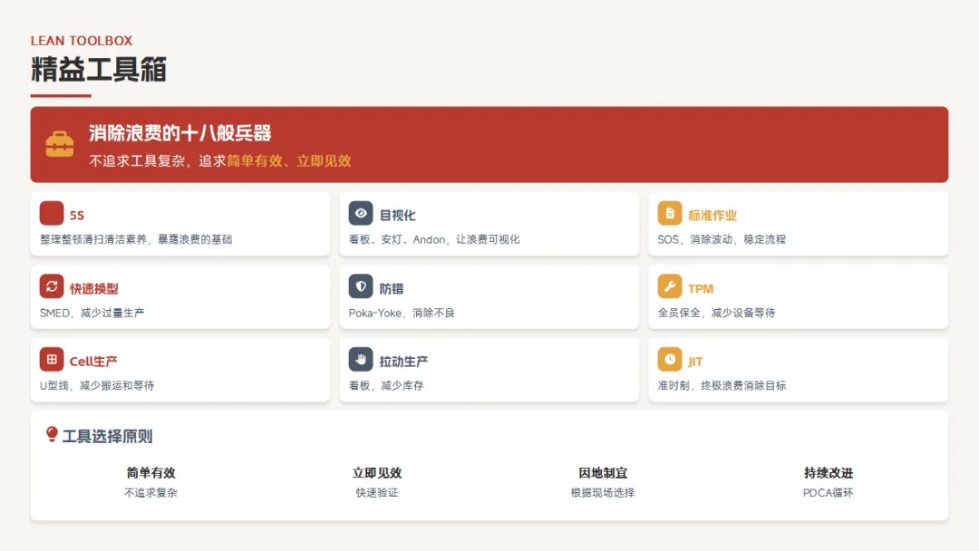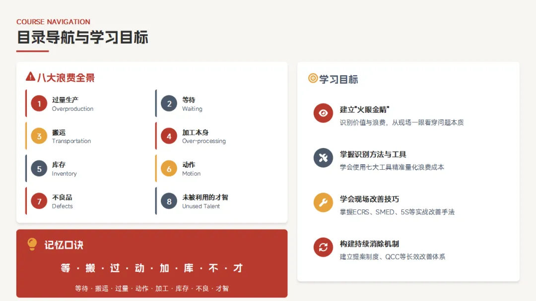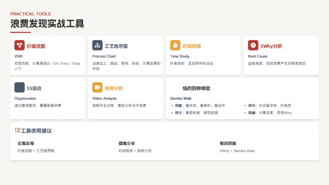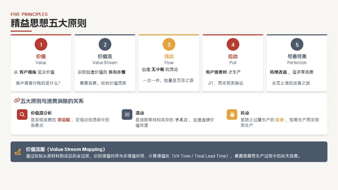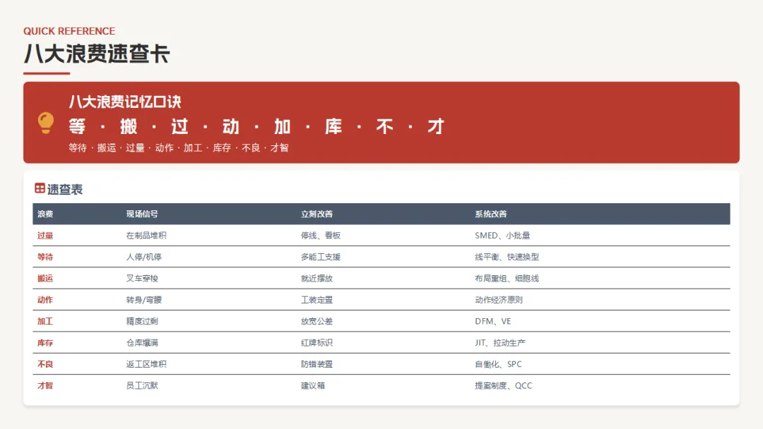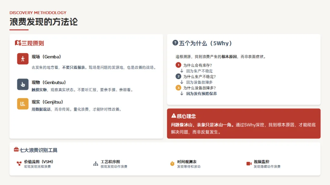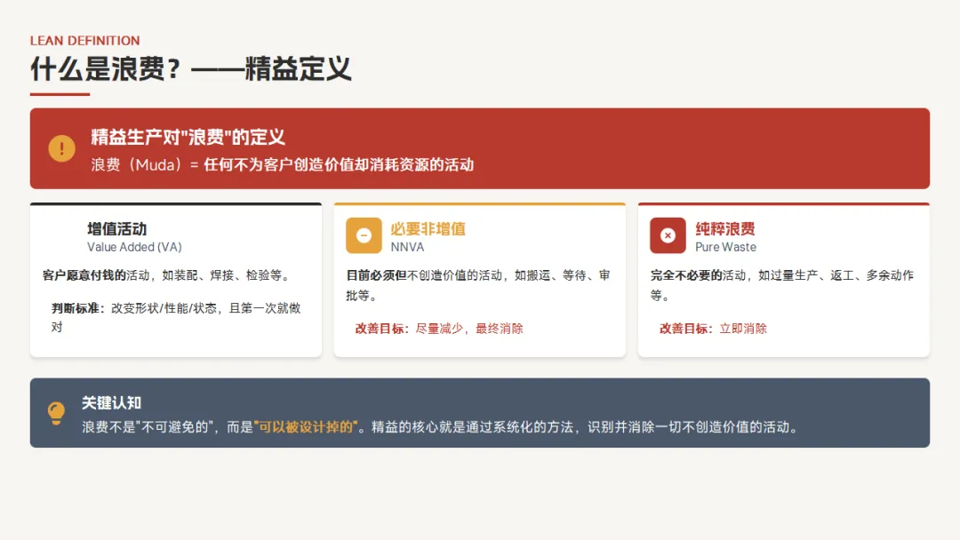关键认知:浪费不是"不可避免的",而是"可以被设计掉的"。精益的核心就是通过系统化的方法,识别并消除一切不创造价值的活动。