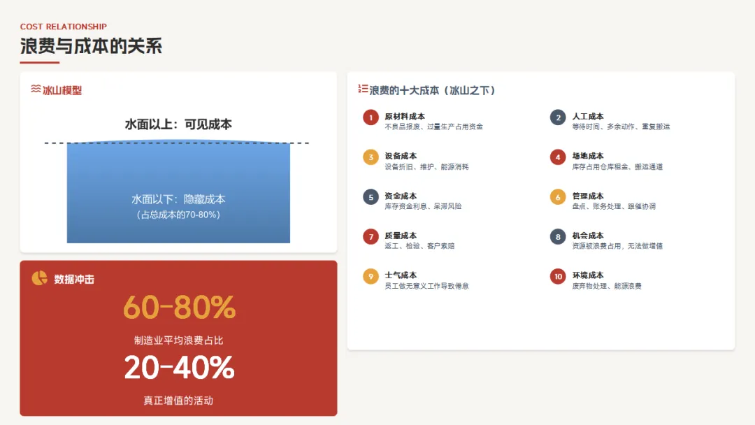 数据冲击显示:制造业平均浪费占比高达60%到80%,而真正创造价值的活动仅占20%到40%。