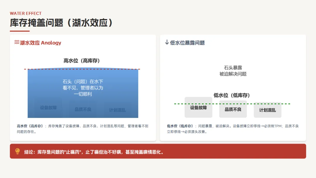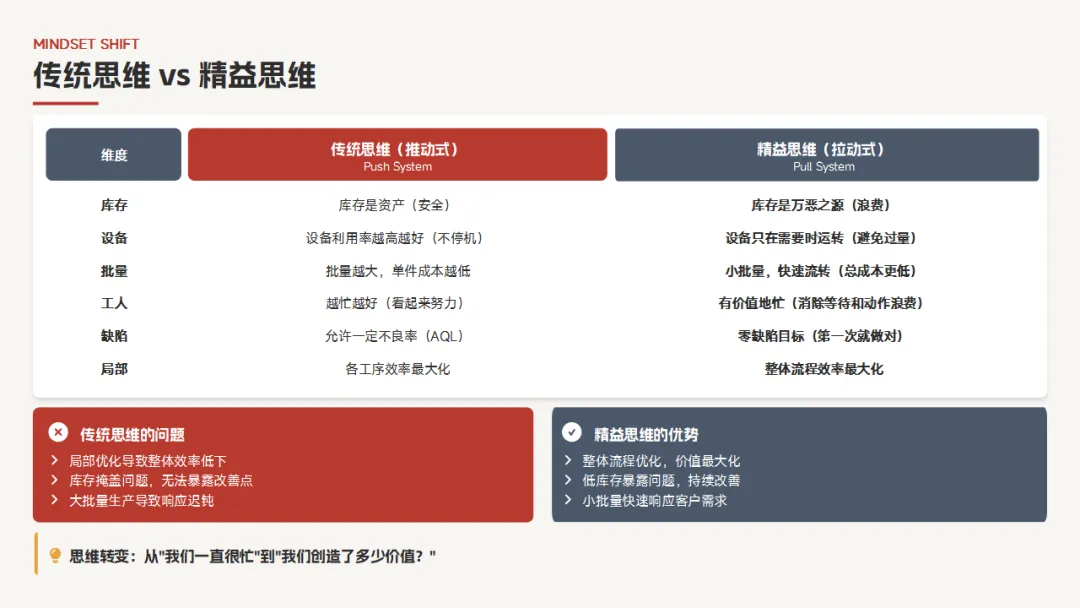 传统思维的问题在于:局部优化导致整体效率低下;库存掩盖问题,无法暴露改善点;大批量生产导致响应迟钝。