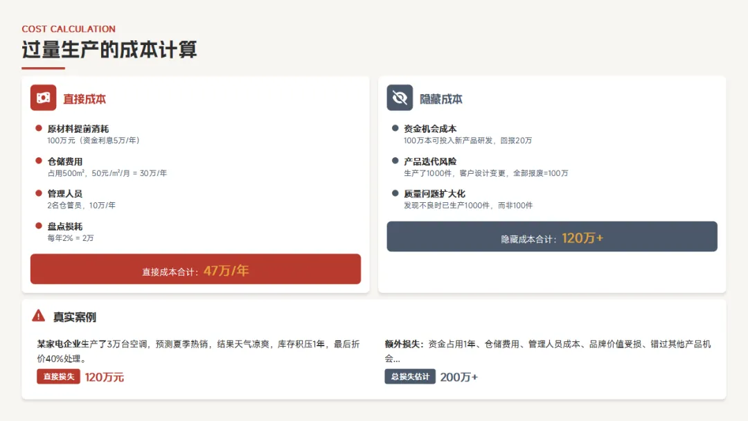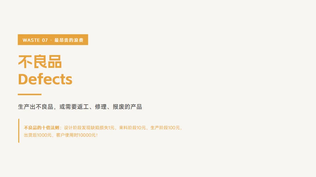第一,原材料成本:不良品报废、过量生产占用资金。