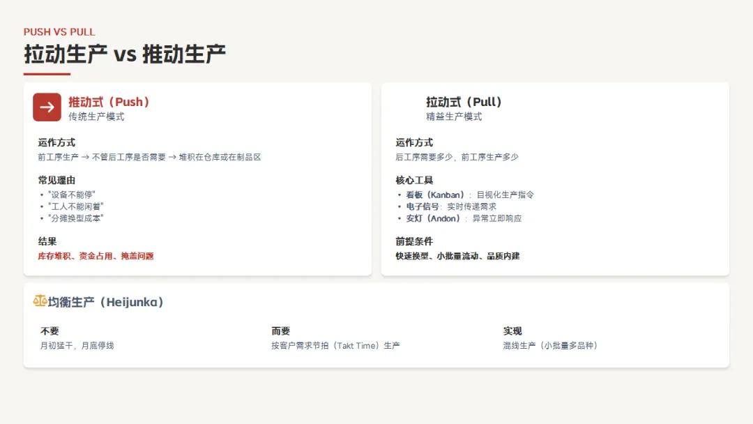 客户需要时才生产,即JIT(Just In Time),而非预测推动。拉动是防止过量生产的疫苗,按需生产而非预测生产。