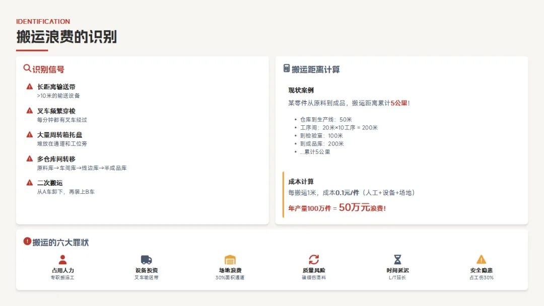 第二,人工成本:等待时间、多余动作、重复搬运。