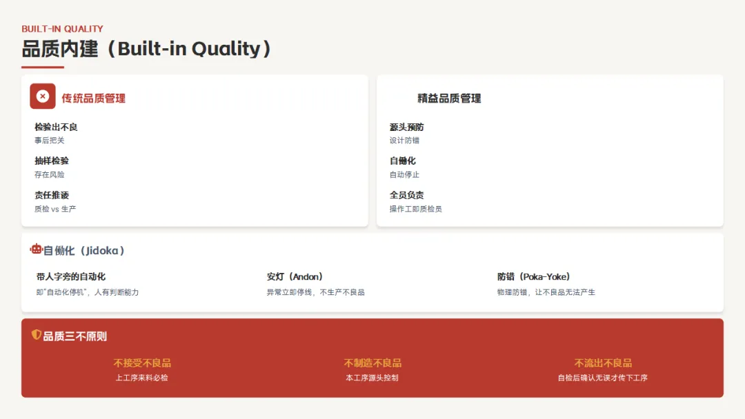 在缺陷容忍上,传统思维允许一定不良率(AQL),而精益思维追求零缺陷目标(第一次就做对)。