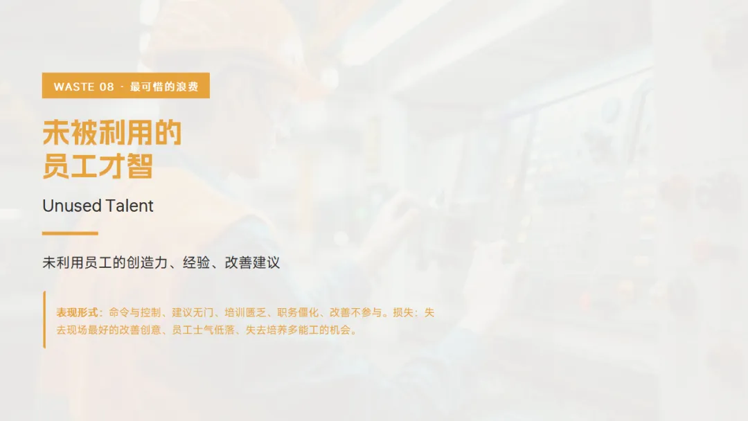 第一,等待(Waiting);第二,搬运(Transportation);第三,过量生产(Overproduction);第四,动作(Motion);第五,加工本身(Over-processing);第六,库存(Inventory);第七,不良品(Defects);第八,未被利用的员工才智(Unused Talent)。