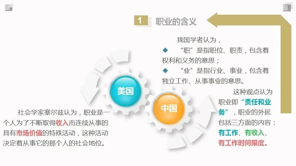 社会学家塞尔兹认为,职业是一个人为了不断取得收入而连续从事的具有市场价值的特殊活动,这种活动决定着从事它的那个人的社会地位。