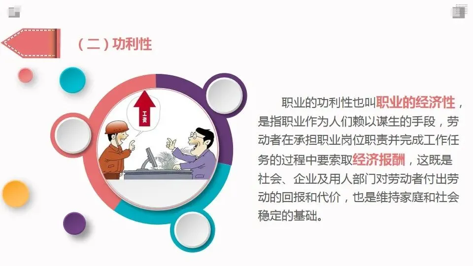 职业的功利性也叫职业的经济性,是指职业作为人们赖以谋生的手段,劳动者在承担职业岗位职责并完成工作任务的过程中要索取经济报酬,这既是社会、企业及用人部门对劳动者付出劳动的回报和代价,也是维持家庭和社会稳定的基础。