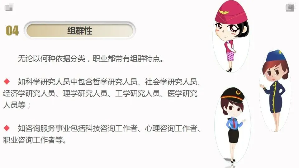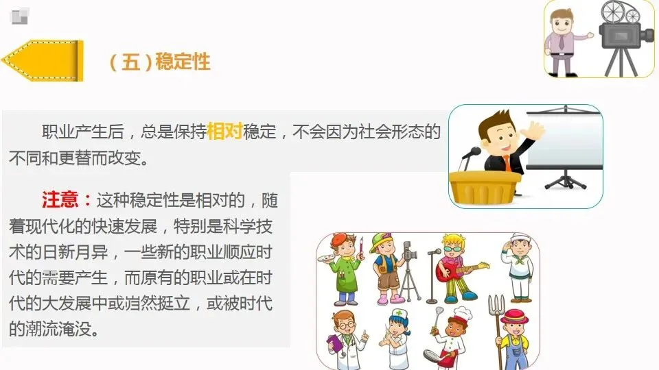 注意:这种稳定性是相对的,随着现代化的快速发展,特别是科学技术的日新月异,一些新的职业顺应时代的需要产生,而原有的职业或在时代的大发展中或岿然挺立,或被时代的潮流淹没。