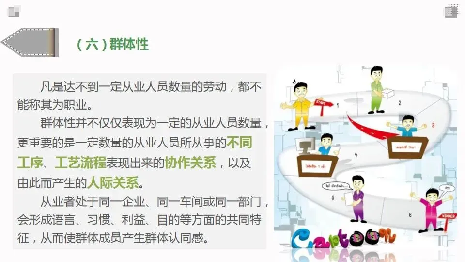 群体性并不仅仅表现为一定的从业人员数量,更重要的是一定数量的从业人员所从事的不同工序、工艺流程表现出来的协作关系,以及由此而产生的人际关系。