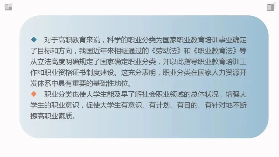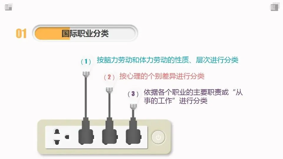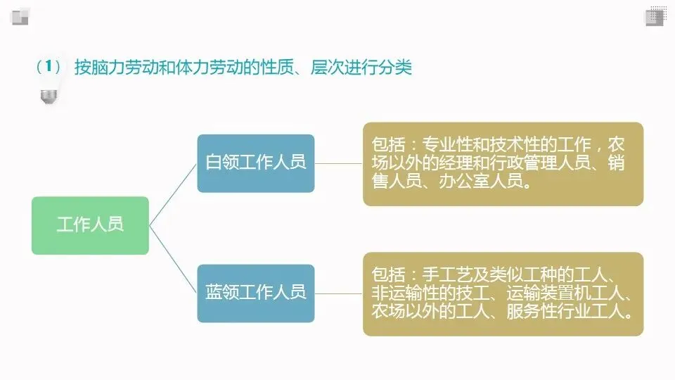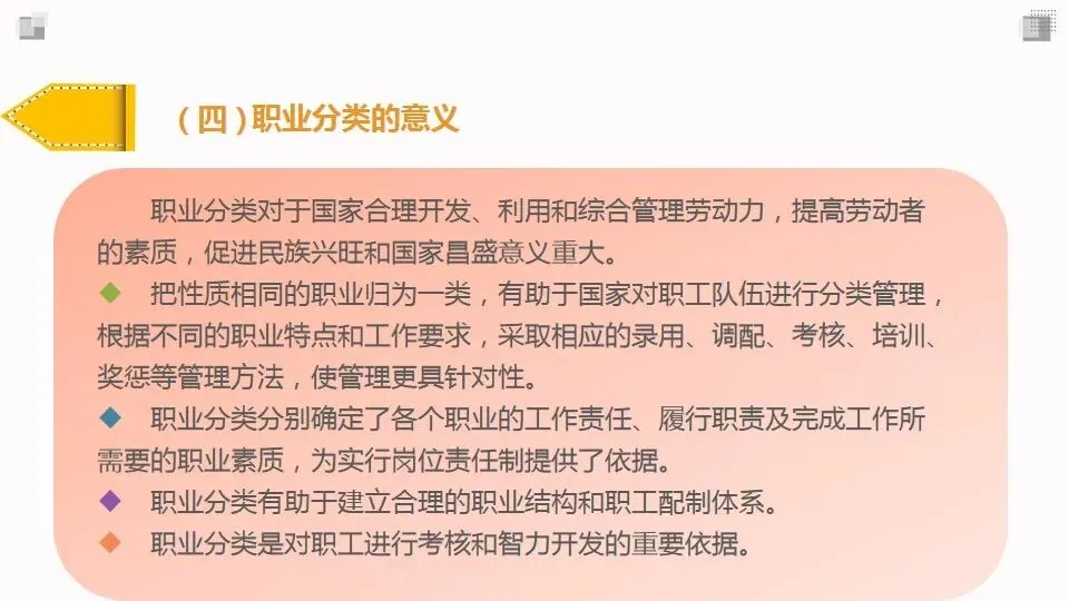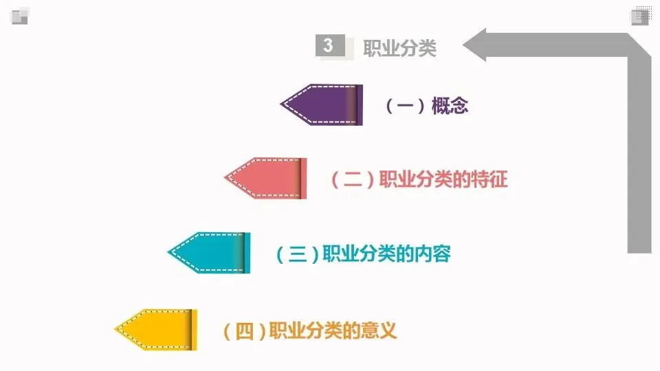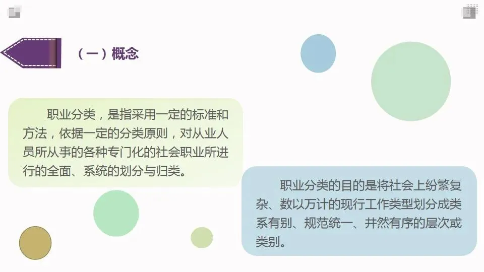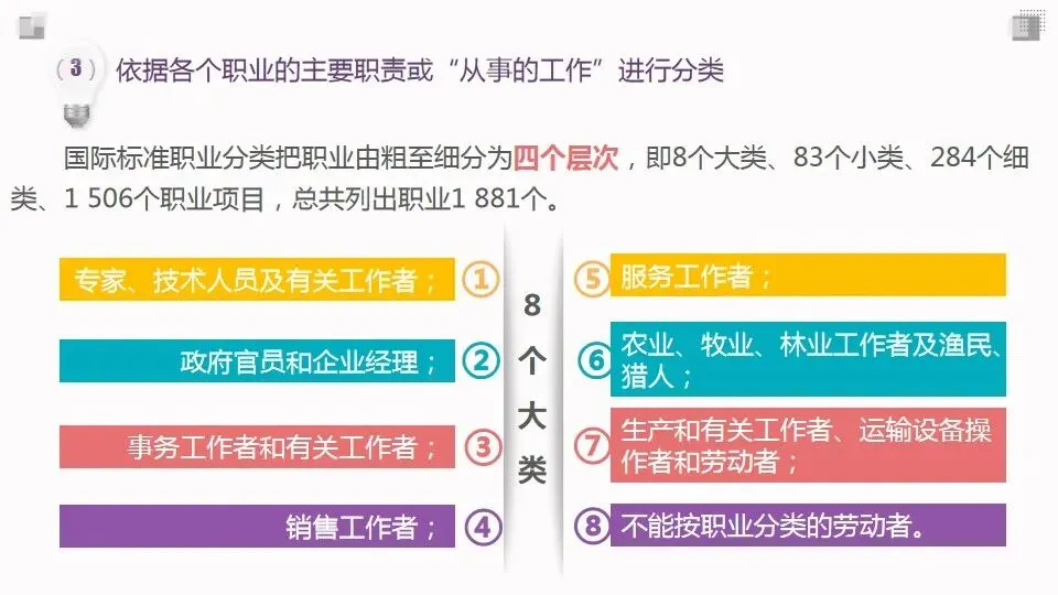 职业分类的目的是将社会上纷繁复杂、数以万计的现行工作类型划分成类系有别、规范统一、井然有序的层次或类别。