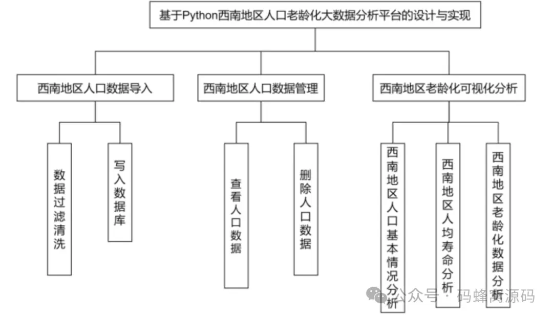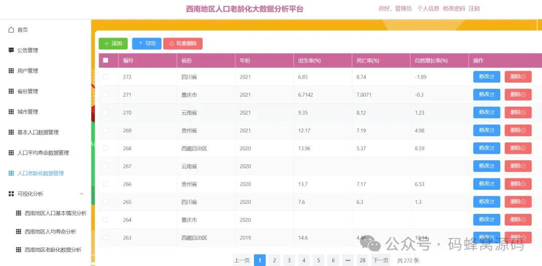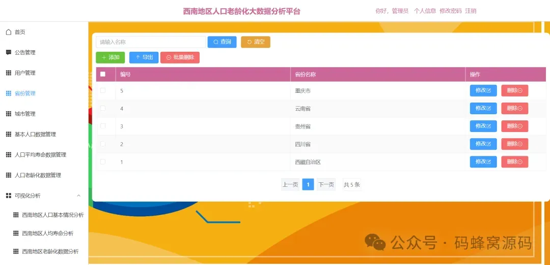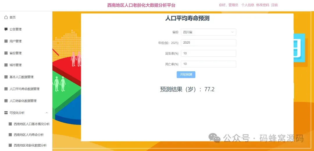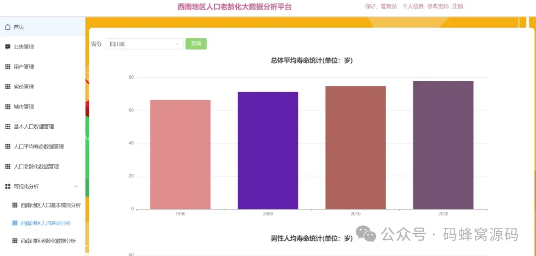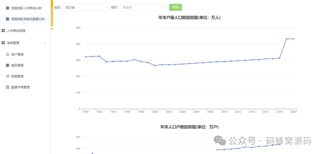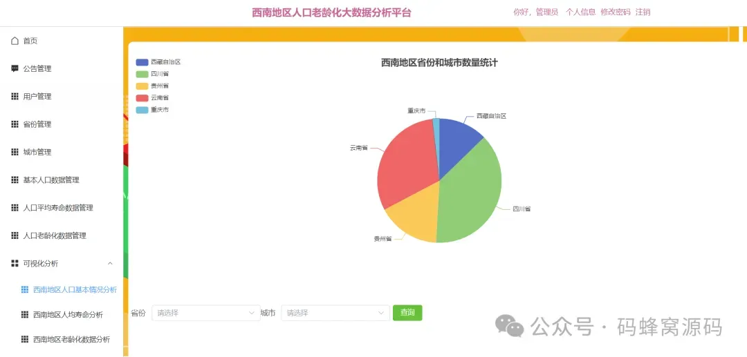 西南地区人口老龄化大数据分析平台的重要核心功能用户注册、用户登录、省份管理、城市管理、基本人口数据管理、人口平均寿命数据管理、人口老龄化数据管理、西南地区人口情况分析、西南地区人均寿命分析、西南地区老龄化数据分析等。具体功能模块如下: